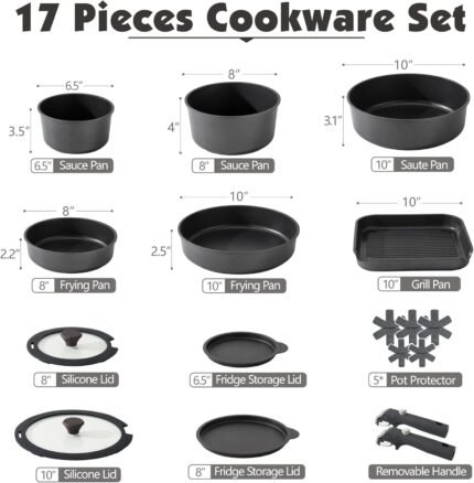 This 17-Piece Nonstick Granite Cookware Set in a sleek black finish is a space-saving and versatile kitchen essential, featuring detachable