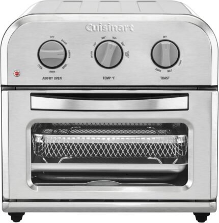 This compact air fryer toaster oven is a space-saving multi-functional appliance that combines 6 essential cooking functions in one sleek