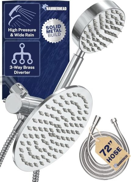 This premium all-metal dual shower head combo brings hotel-caliber luxury to your home, featuring an 8-inch round rainfall shower head