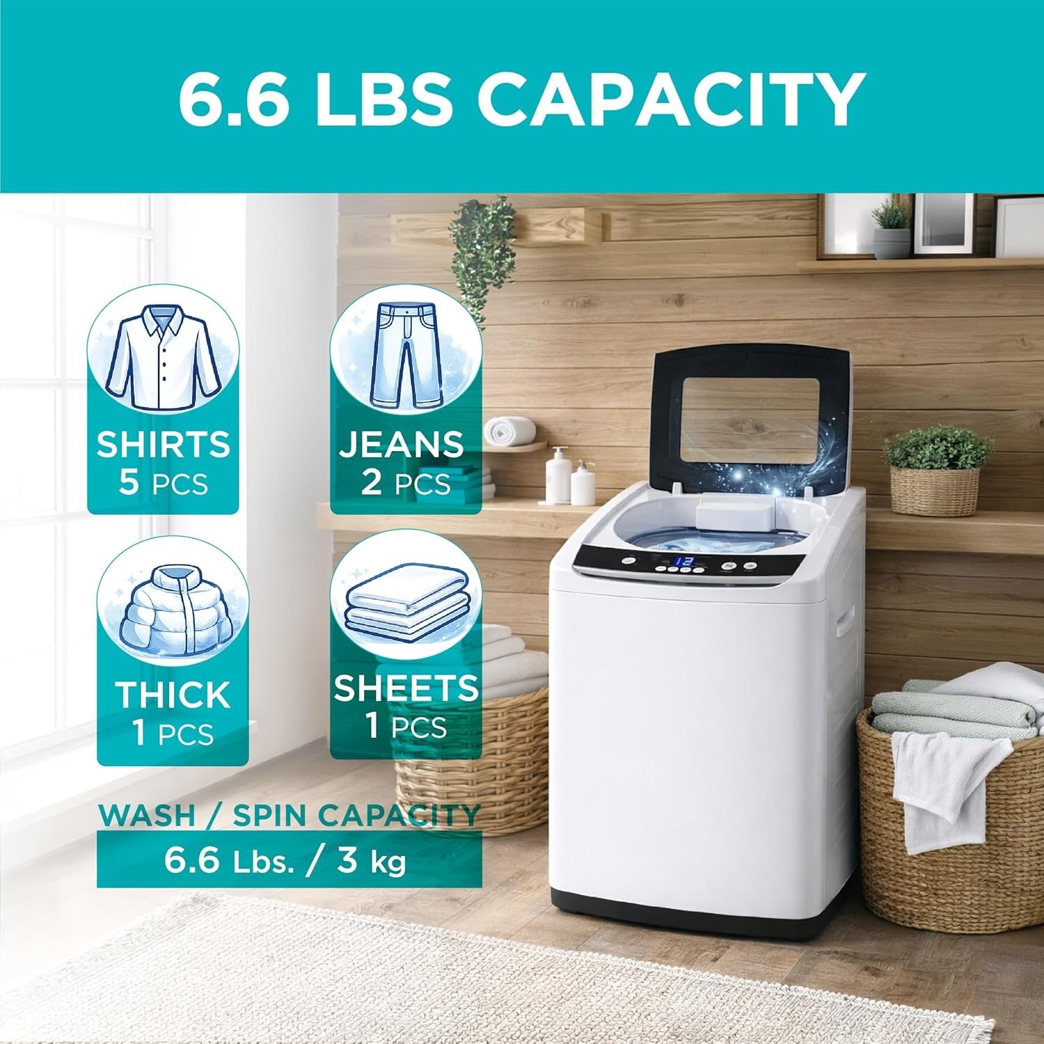 - Cold Water Wash Only: This portable washing machine offers 3 water level choices for small, medium, and large loads up to 6.6 lbs. capacity for cold water only temperature settings