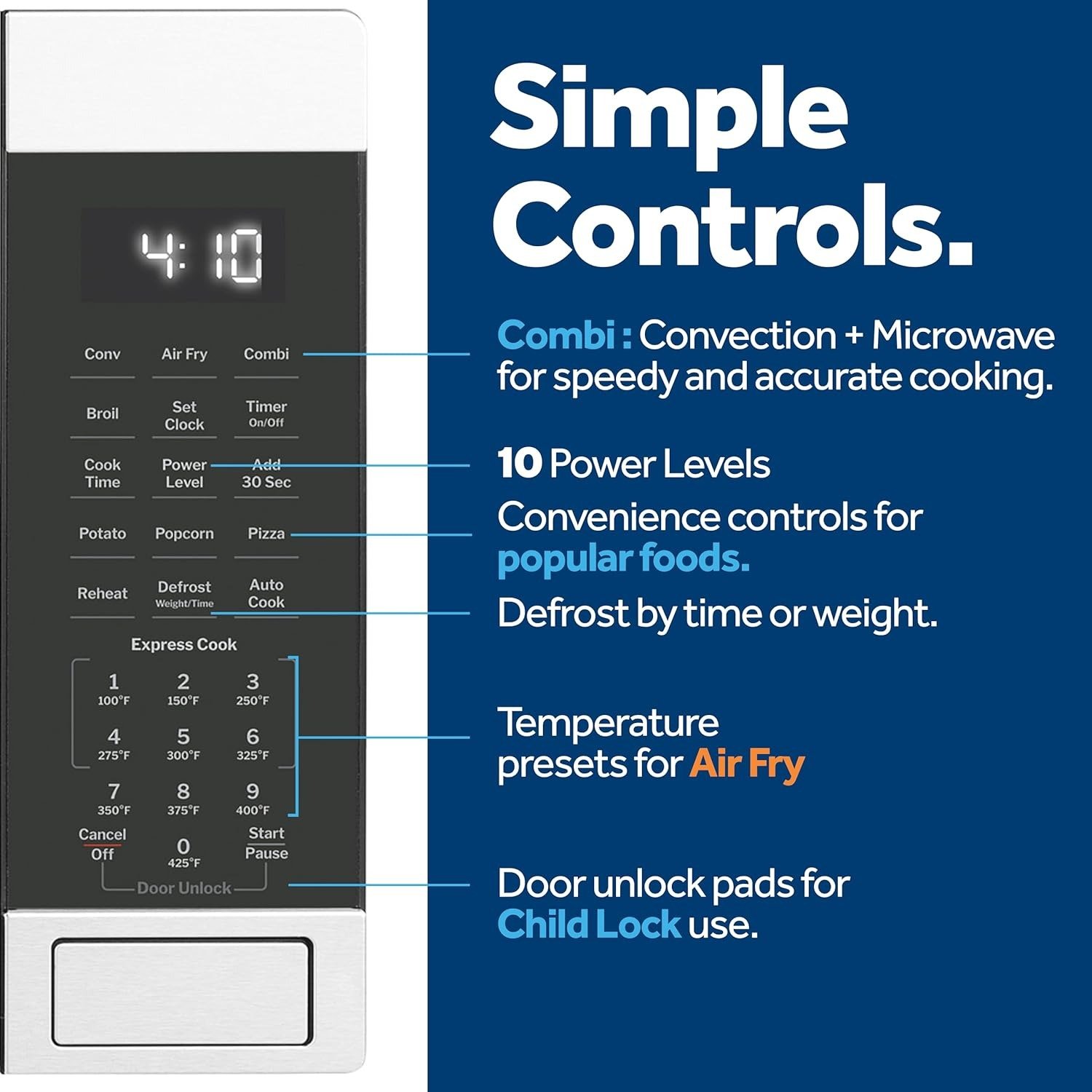 Cooking Functions: 4-in-1 (Microwave, Air Fry, Convection Bake, Broil) + Combi (Convection + Microwave)