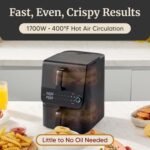 Powered by a 1700W high-performance motor and rapid hot air circulation technology, it cooks food fast and evenly up to 400°F, delivering crispy, golden results for fries, wings, steak and more with little to no oil—cutting up to 80% of fat compared to traditional deep frying. Most foods require no preheating, cooking faster and more efficiently for hassle-free meals. The intuitive LED digital touch control panel features 10 one-touch cooking presets (Fries, Bake, Veggies, Wings, Seafood, Steak, Toast, Pizza, Roast, Reheat) plus fully manual adjustment for temperature (180°F-400°F) and time (up to 60 minutes), suiting all your cooking needs.
