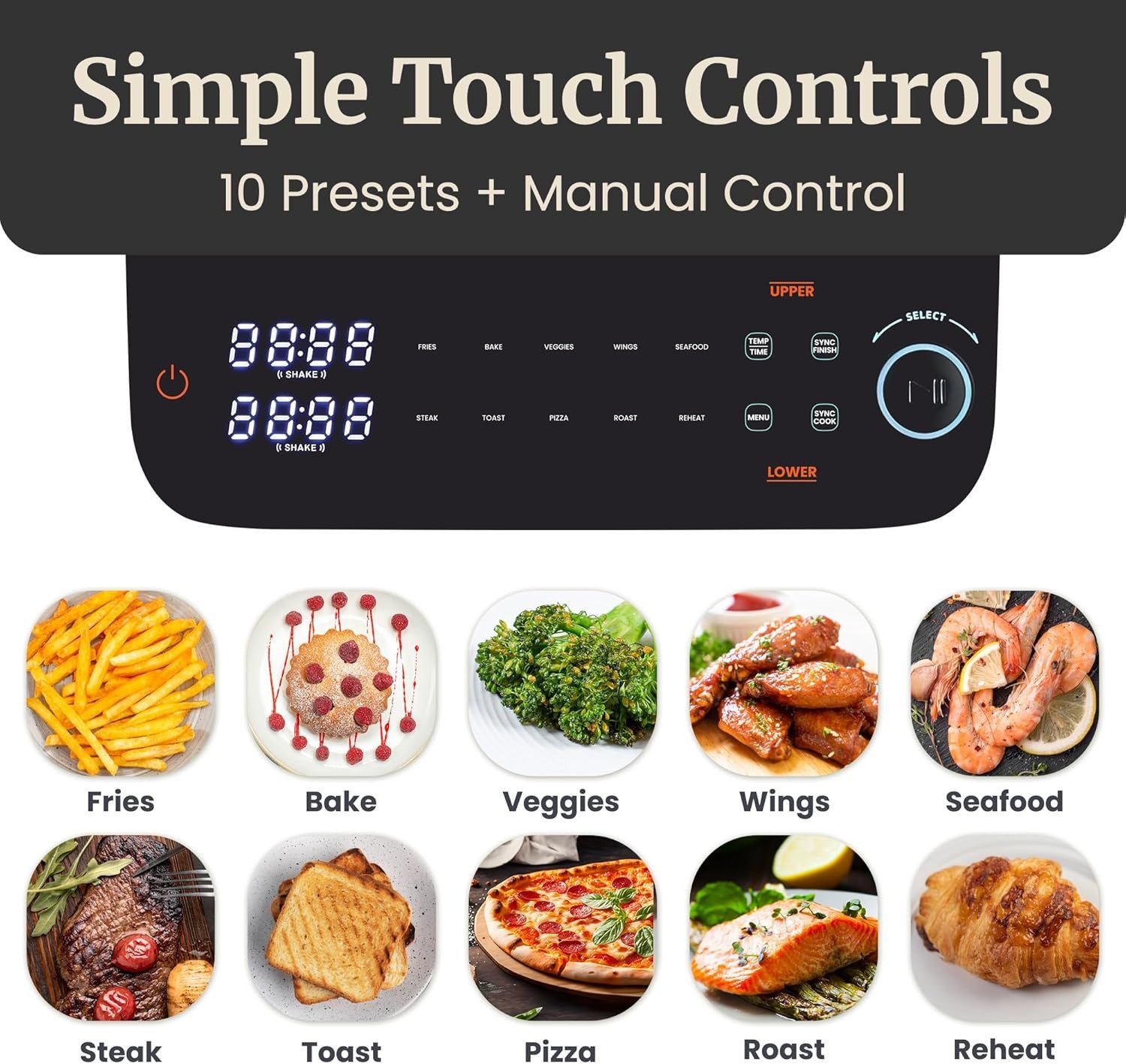 Equipped with Sync Cook & Sync Finish technology, this dual air fryer delivers ultimate cooking flexibility: use Sync Cook to mirror temperature and time settings across both baskets for large batches of the same food, or select Sync Finish to set different temps/times for each basket—ensuring all dishes finish cooking together, hot and ready to serve at the same time. No more waiting for one dish to cook before starting another, streamlining meal prep and saving time.