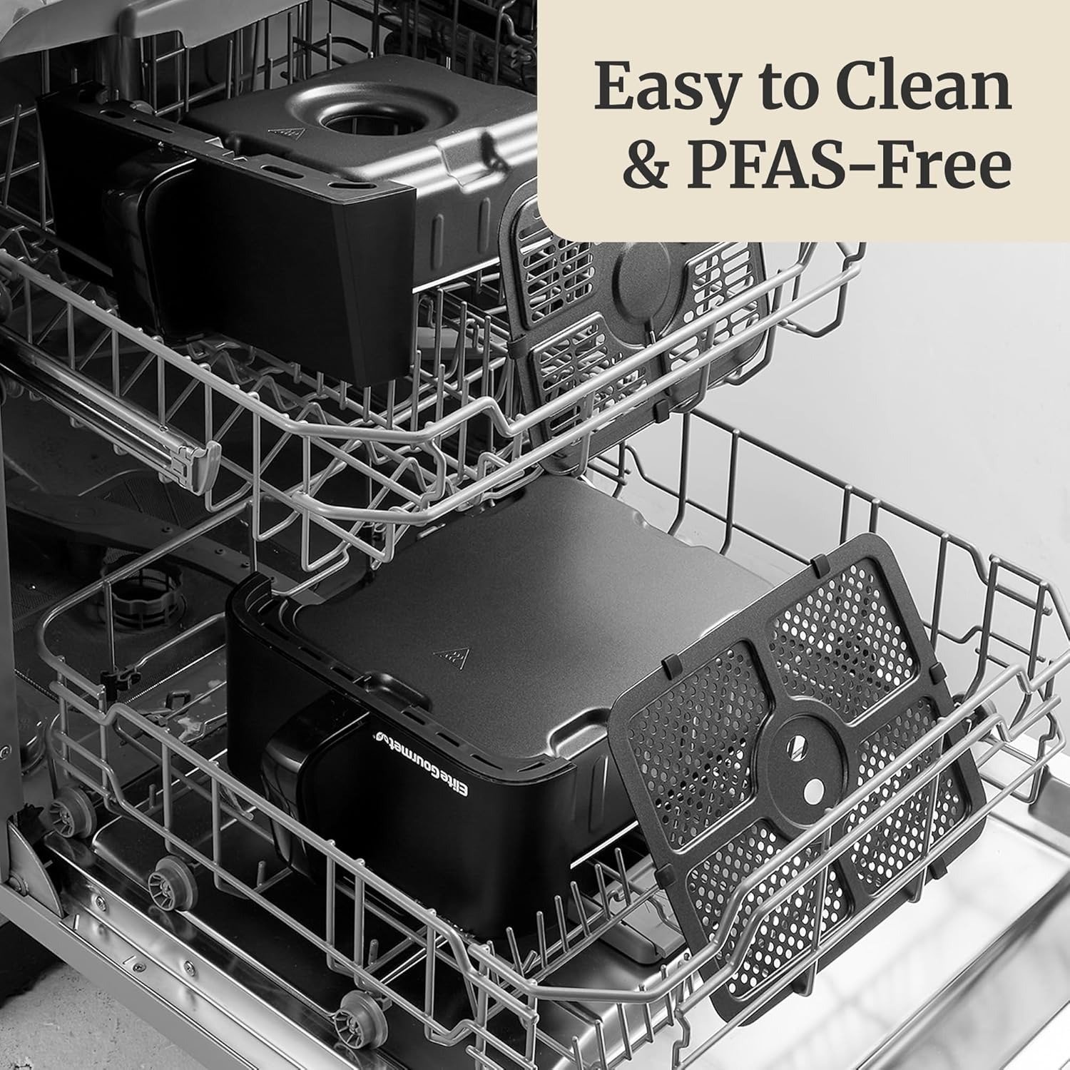 Both cooking baskets feature PFAS-free nonstick coatings for effortless food release and quick cleanup, and all removable parts are top-rack dishwasher safe—eliminating tedious hand scrubbing. Built with durable stainless steel construction and a sleek matte black finish, it includes an instruction manual and 34-recipe guide to inspire endless healthy cooking options, from roasted vegetables and juicy seafood to crispy snacks and baked goods. An automatic shut-off feature adds an extra layer of safety for worry-free cooking.