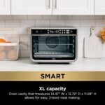 The Air Fry function delivers up to 75% less fat than traditional deep frying (for hand-cut fries) and up to 30% crispier results than standard convection ovens, while the baking mode provides up to 50% more even baking than leading countertop ovens. A digital display handle enhances usability: optimal oven rack positions illuminate based on your selected function, and settings freeze when the door is open to prevent accidental cook cycle changes.