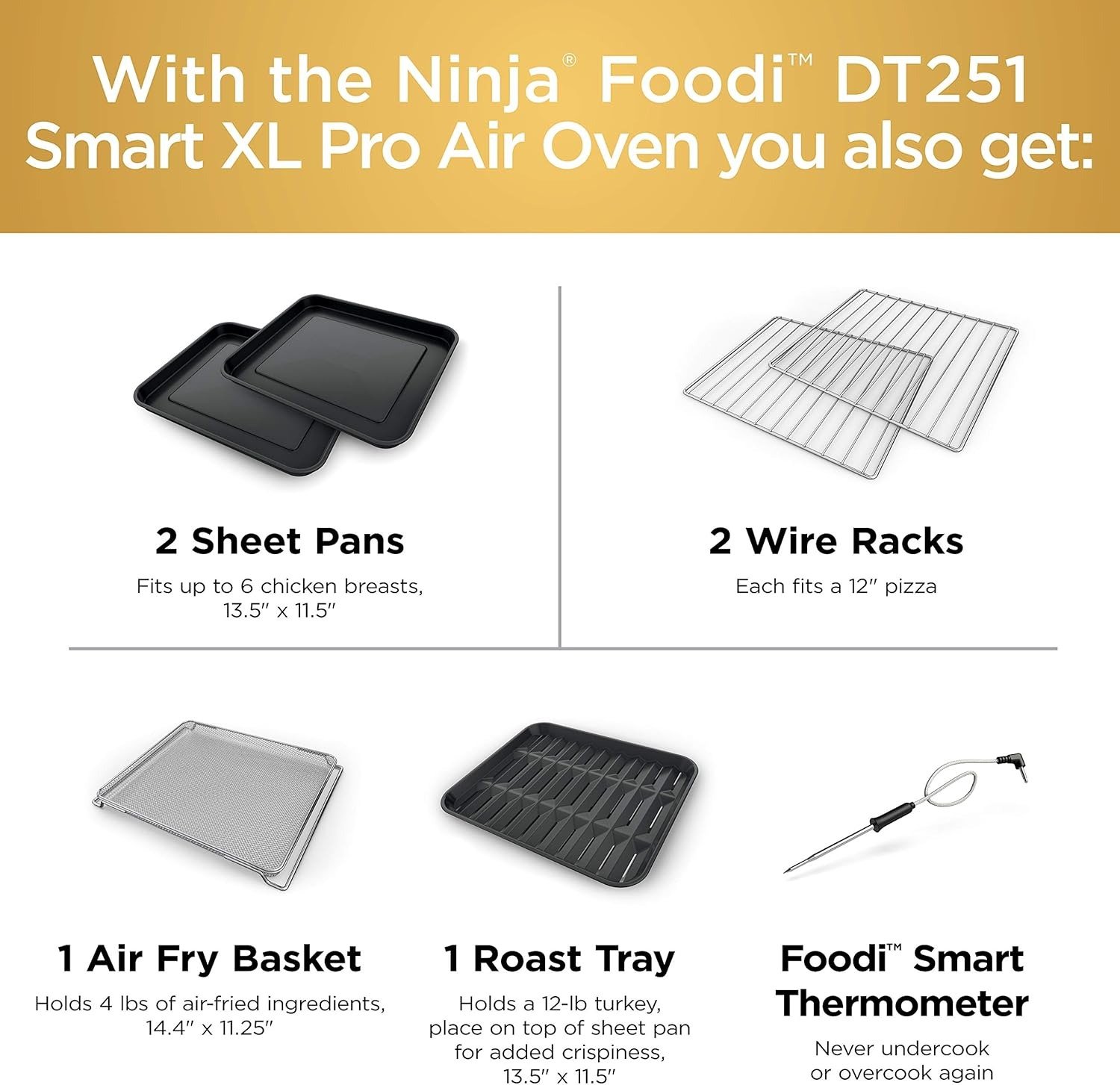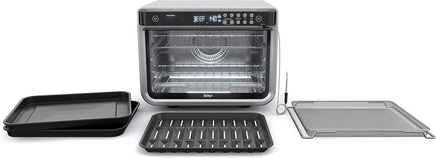 Included Components: Main Oven Unit, 2 Sheet Pans, 2 Wire Racks, Air Fry Basket, Roast Tray, Crumb Tray, Smart Thermometer, 15-Page Recipe Guide