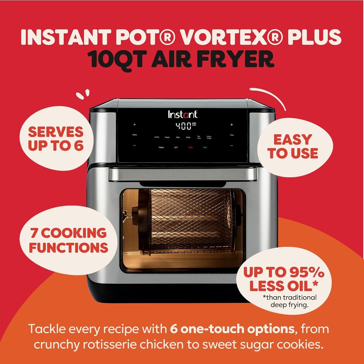- Customizable Smart Programs: Tackle every recipe with 6 one-touch options, from crunchy rotisserie chicken to soft sugar cookies