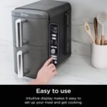 Crafted with durable plastic construction and a sleek grey finish, the air fryer features intuitive touch controls for easy operation, with programmable settings, temperature control (up to 450°F), and a built-in timer for precise cooking. The nonstick baskets and removable parts are dishwasher safe, making cleanup fast and effortless—no tedious scrubbing required. The compact footprint (11.25″D x 19.22″W x 15.14″H) maximizes countertop space without compromising performance, delivering the power of 2 air fryers in a single unit.