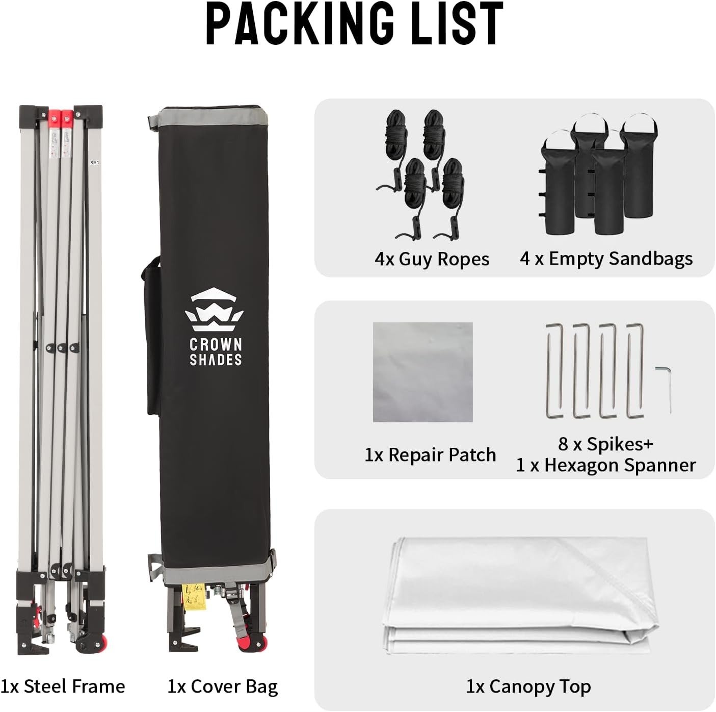 - SPACIOUS AND COMPACT – With a 10′ x 10′ canopy footprint, this tent provides 100 square feet of shade, accommodating up to 10 people comfortably. The interior height exceeds 9 feet, and the maximum clearance under the valance is over 6 feet. When packed, the dimensions are 45” x 8.5” x 8.5”, fitting perfectly in your vehicle’s trunk. The headroom is enhanced by the absence of overhead crossbars, offering more spaciousness compared to traditional designs, making it great for parties and events.