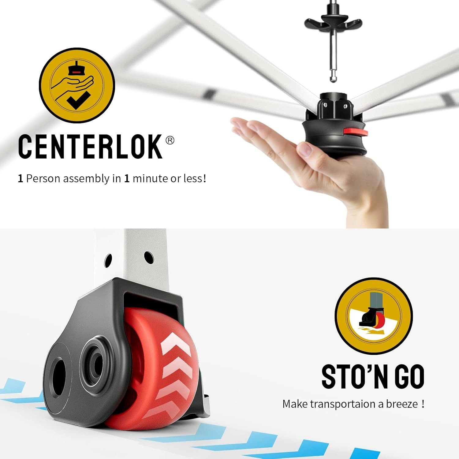 - STO’ N GO SYSTEM – Our lift-free storage and transport system makes it easy to collapse the party tent, cover it with the bag, and roll it away. The 10×10 tents can be stored with the fabric attached, with a pocket for 4 sandbags, 8 stakes, and 4 guy ropes. Integrated wheels in the feet allow easy movement even when the instant shelter is set up, by simply lifting the side without wheels. This feature is especially useful for quick setup and takedown at locations like the sports or events.