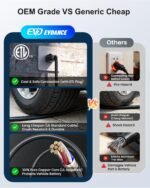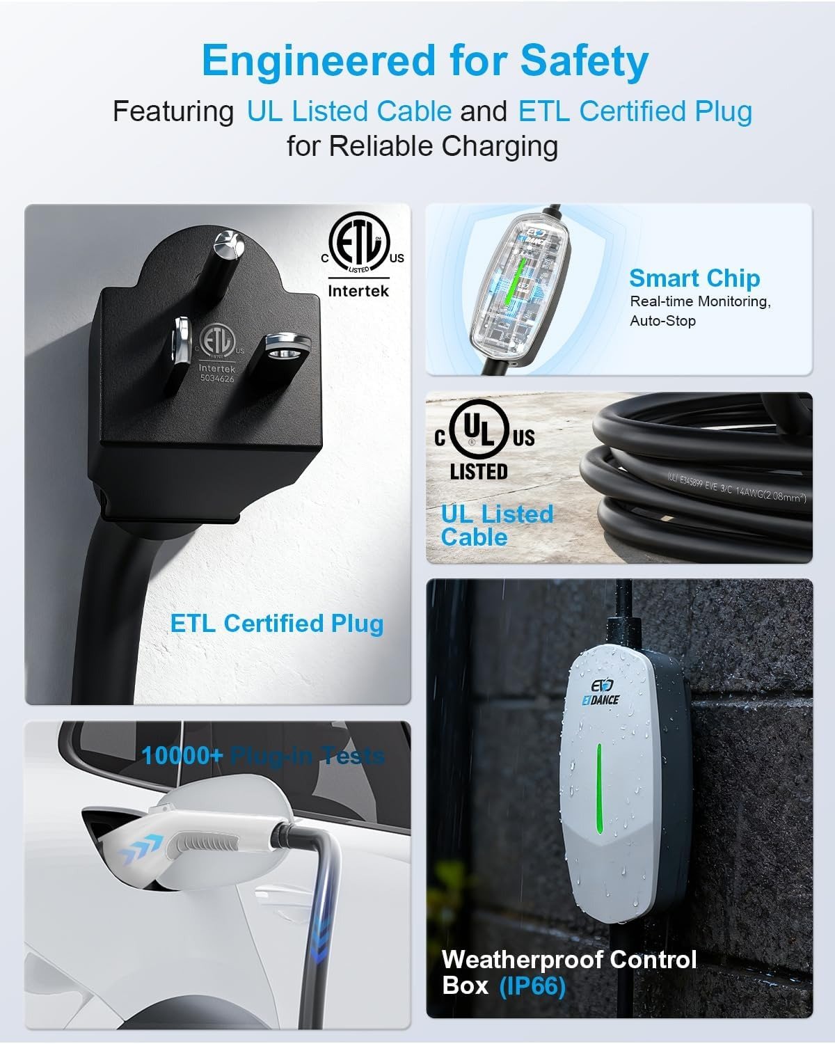 - Durable and Safe – This electric car charger is made of high-grade rugged materials, FCC and CE certified. The intelligent chip design of its control box can keep monitoring the charging status at any time, and the protection level of the housing is IP66 and the fire rating is UL 94 V-0.