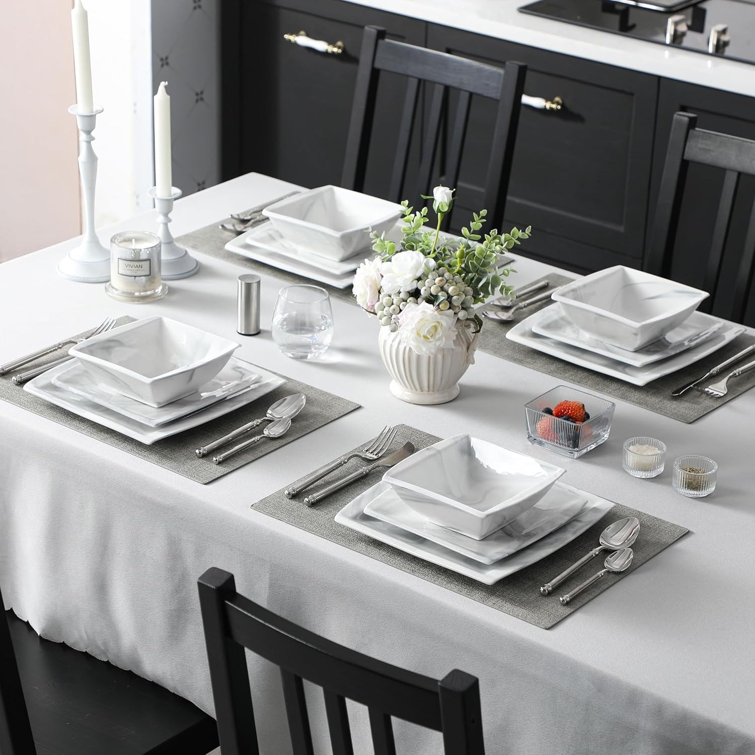 This 12-Piece Porcelain Dinnerware Set in a elegant marble pattern is a stylish and practical tableware solution crafted to serve 4 people, featuring a sleek square low-profile design with unique natural marble lines that add a touch of luxury and sophistication to any casual or formal dining occasion. Each piece is hand-finished, so the marble veining varies slightly—making every plate and bowl one-of-a-kind—while the glossy surface enhances visual appeal and facilitates effortless cleanup.