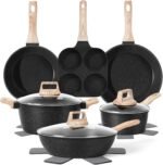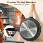 Built with durable die-cast aluminum construction, each piece heats up quickly and distributes heat evenly across the entire cooking surface, eliminating hot spots and guaranteeing consistent results for frying, simmering, sautéing, and boiling. The comprehensive 13-piece set includes all kitchen cooking essentials: 1.5QT sauce pan with lip, 4.3QT sauce pan with lip, 11inch/4.5QT sauté pan, 9inch/11inch frying pans, egg pan, and 4 pan protectors—perfect for quick breakfasts, weeknight dinners, and multi-course meals, with pan protectors preventing scratches during storage.