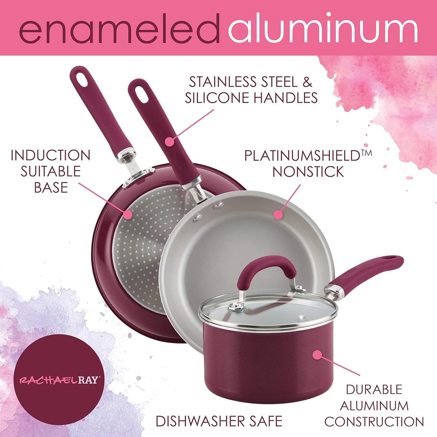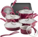 Special Features: Burgundy Shimmer Finish, Shatter-Resistant Glass Lids, Drip-Free Pouring, Induction-Ready Base, All-in-One Cookware/Bakeware/Utensil Set