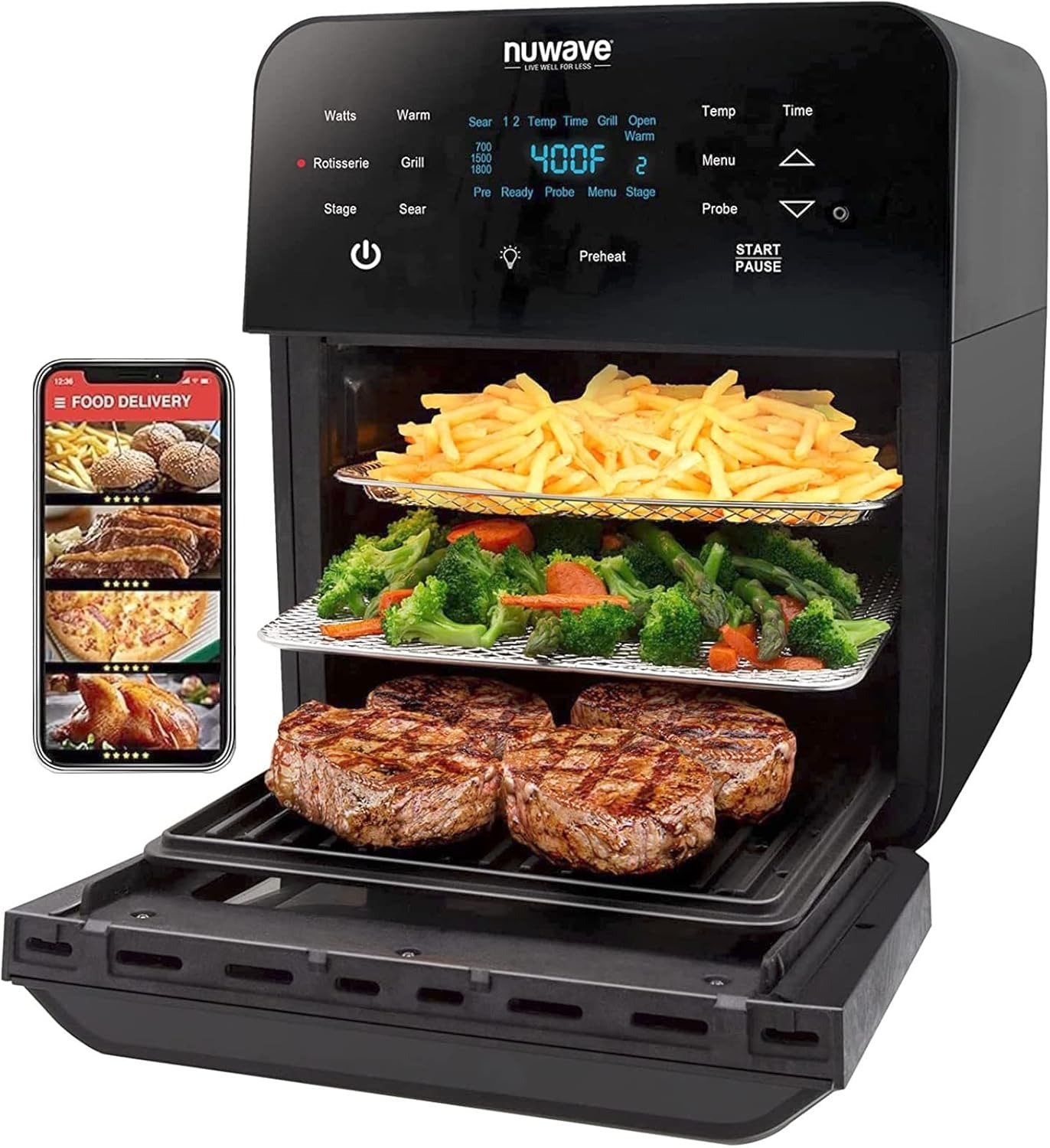 Special Features: 100 Pre-Programmed Presets + 50 Memory Slots, On-the-Fly Adjustments, Constant Temperature Tech, 4 Adjustable Racks, Internal Cooking Light, Door Auto-Pause, 3 Wattage Modes, Smokeless Indoor Grilling