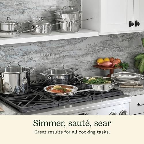 - COOKING AND CLEANING: Experience professional performance with an aluminum encapsulated base that heats quickly and spreads heat evenly, eliminating any hot spots and providing versatile performance. The stainless steel cooking surface does not discolor, react with food or alter flavors. Cookware set is oven safe up to 500 F and is dishwasher safe, making cleanup effortless