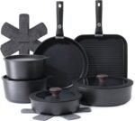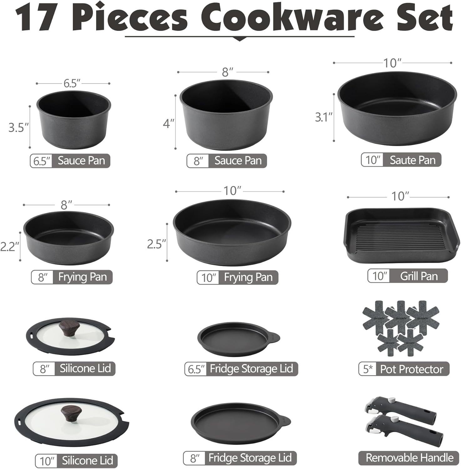 Set Includes: 1.5QT Sauce Pan, 2.8QT Sauce Pan, 8″ Frying Pan, 10″ Frying Pan, 10″(4QT) Sauté Pan, 10″ Grill Pan, Removable Handle2, 8″ Glass Lid, 10″ Glass Lid, Pot Protector5, Fridge Storage Lid*2 (Total 17pcs)