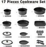 Designed for ultimate space efficiency, this cookware set saves up to 70% of storage space with a stackable design and detachable handles, perfect for small kitchens, cabinets, and RVs. The professionally tested removable handles support up to 22 pounds, providing a stable, wobble-free grip and allowing seamless transition from stovetop to oven, fridge to table. The comprehensive 17-piece set includes all cooking essentials: 1.5QT/2.8QT sauce pans, 8″/10″ frying pans, 10″(4QT) sauté pan, 10″ grill pan, 2 removable handles, 8″/10″ glass lids, 5 pot protectors, and 2 fridge storage lids—covering all your frying, sautéing, grilling, and simmering needs.