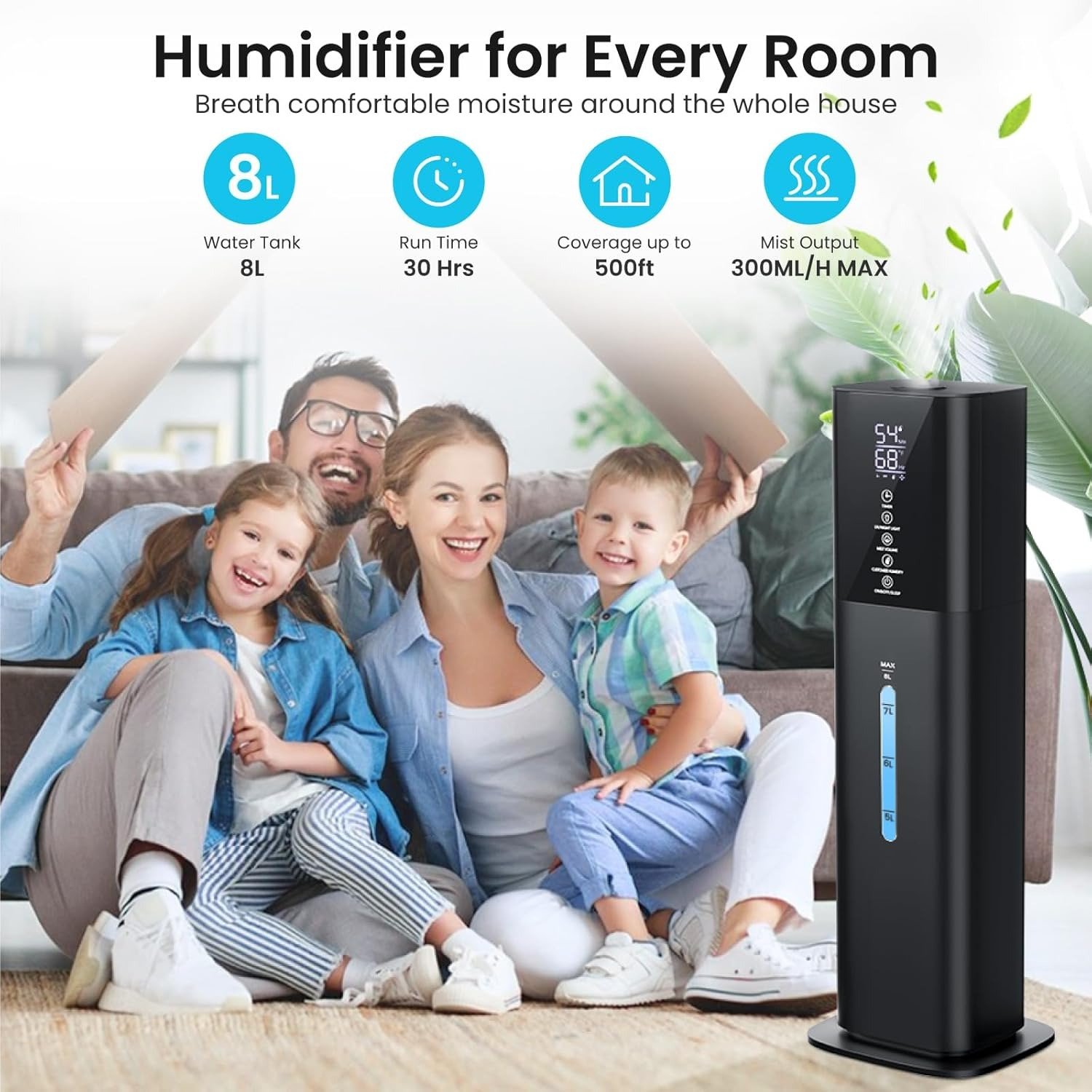 This 2.1Gal(8L) Ultrasonic Cool Mist Humidifier is a high-performance air humidifying solution designed for large rooms, bedrooms, nurseries and more, featuring a massive 8-liter removable water tank with a leak-proof top-filling design for easy refilling and no frequent water addition—delivering up to 40 hours of continuous mist on a single refill with a 300mL/h high moisture output, effectively humidifying spaces up to 550 sq.ft to relieve air and skin dryness for the whole family, plants and pets. Built with an integrated ceramic filter that requires no replacement, it cuts down on ongoing usage costs and simplifies maintenance.