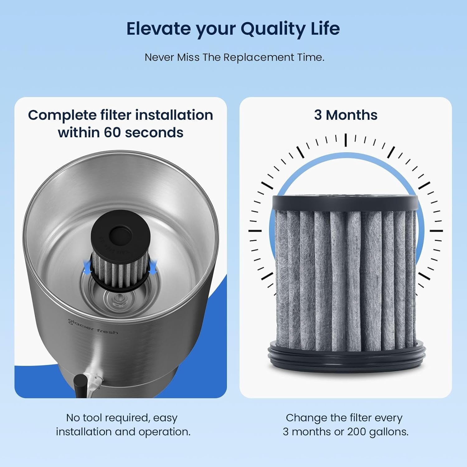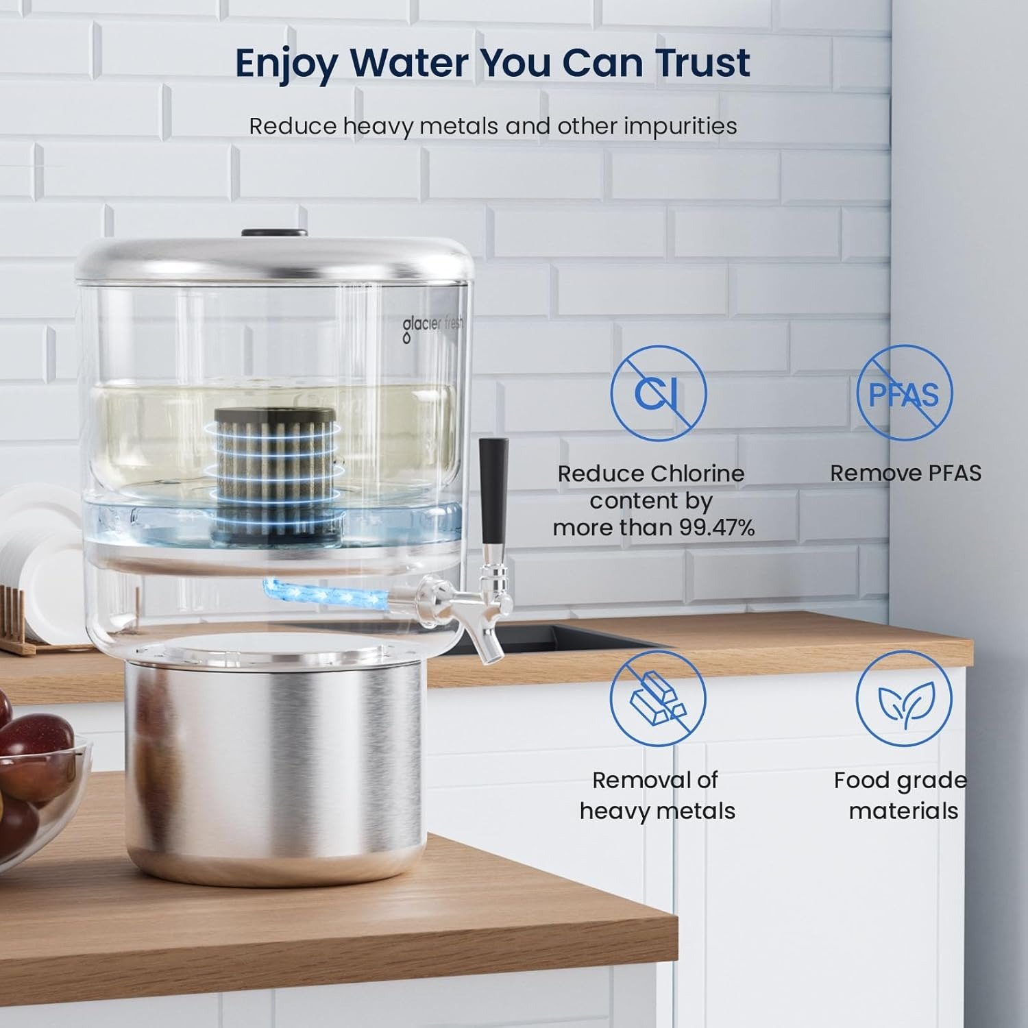 - The GLACIER FRESH stainless steel gravity water filter features a uniquely engineered water inlet system that minimizes leftover water. This ensures nearly zero drinking water residue, prevents stale water buildup, and improves hygiene and efficiency—ideal for households looking for a high-use countertop water filter system.