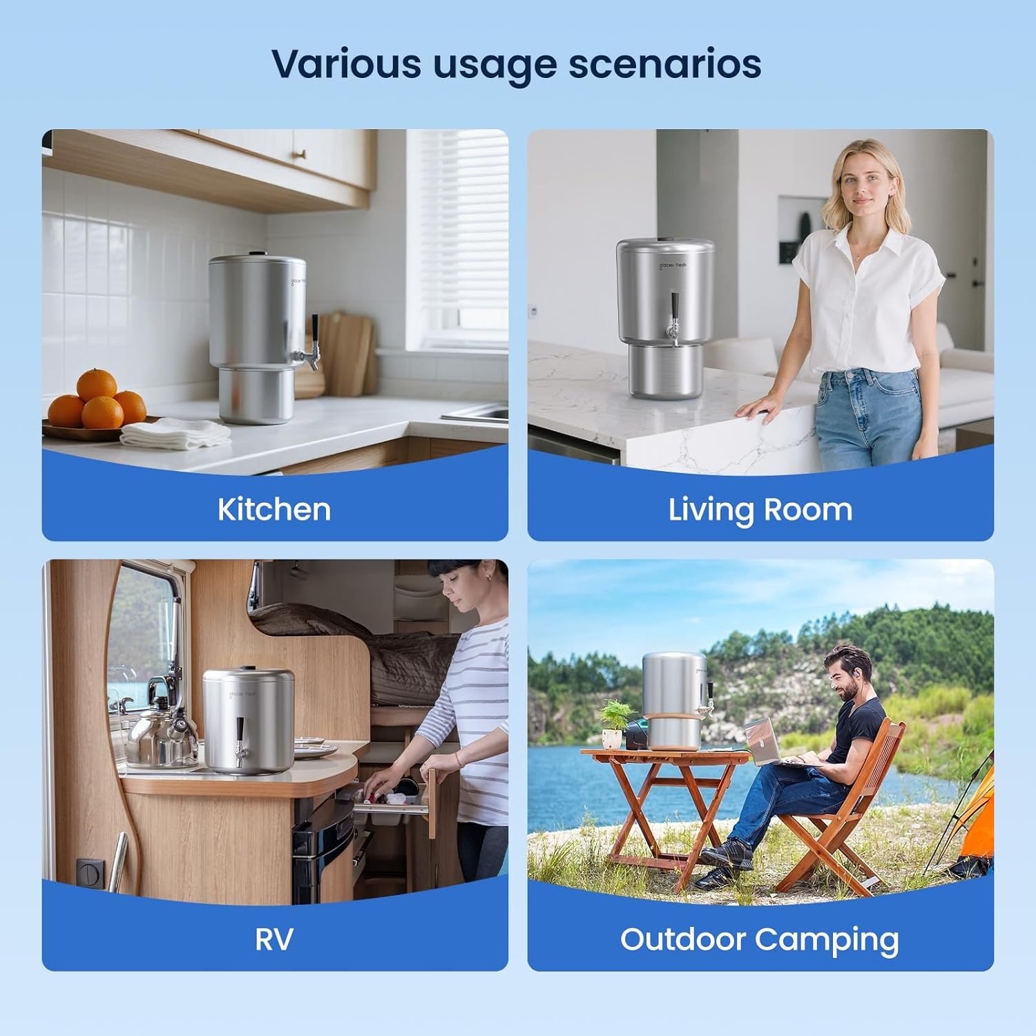 - Built for families, this 2.25-gallon stainless steel water filtration system provides ample purified water for up to 4 people, making it perfect for home kitchens, apartments, RVs, camping, and emergency preparedness. A dependable high-capacity gravity water filter for daily use or outdoor adventures.