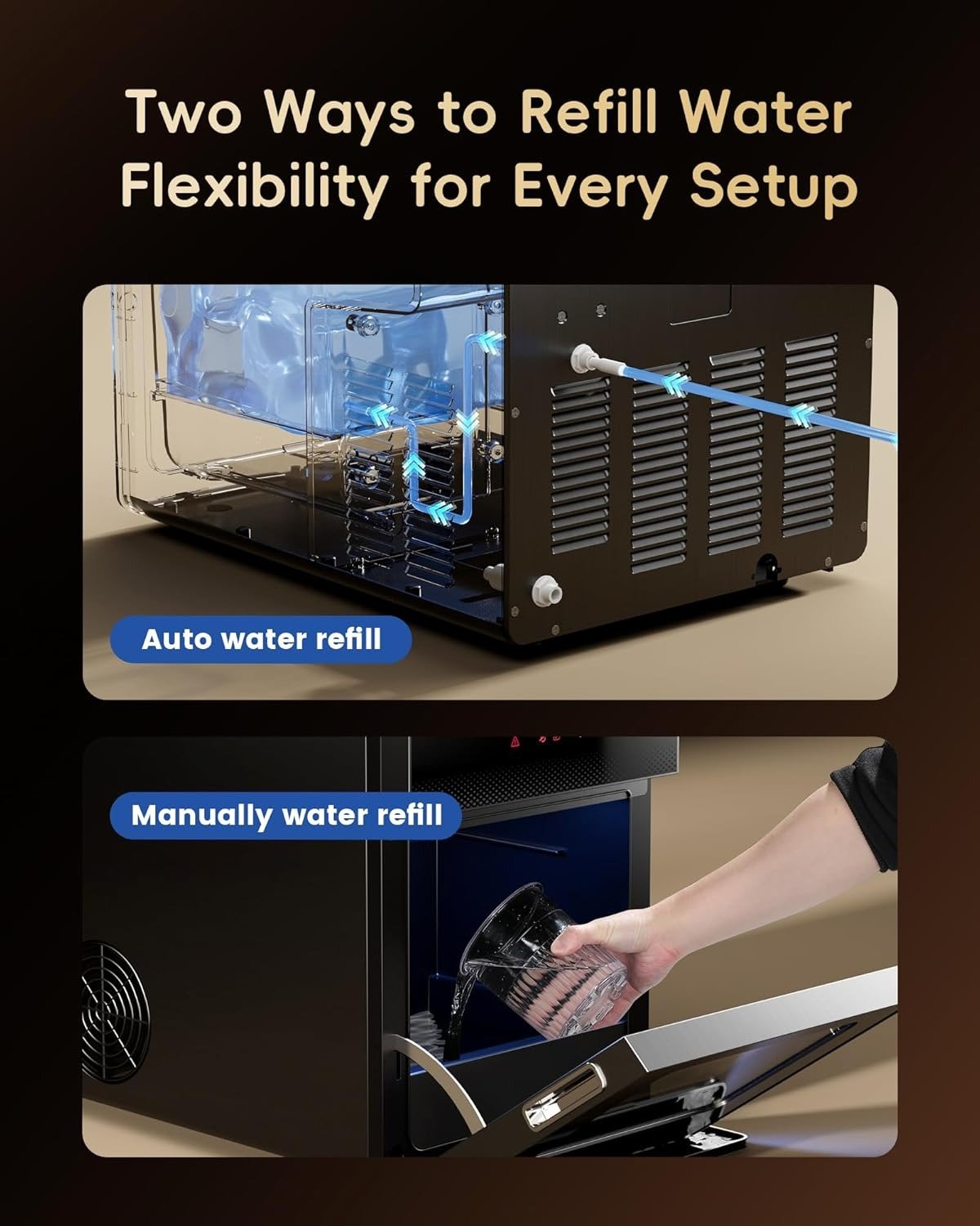 - Easy Water Entry: Connect to a water line for endless ice without interruptions, saving time and effort. Or use the 0.45-gallon built-in tank for flexibility. Plus, the bottom drain design allows easy water removal when placed on a countertop