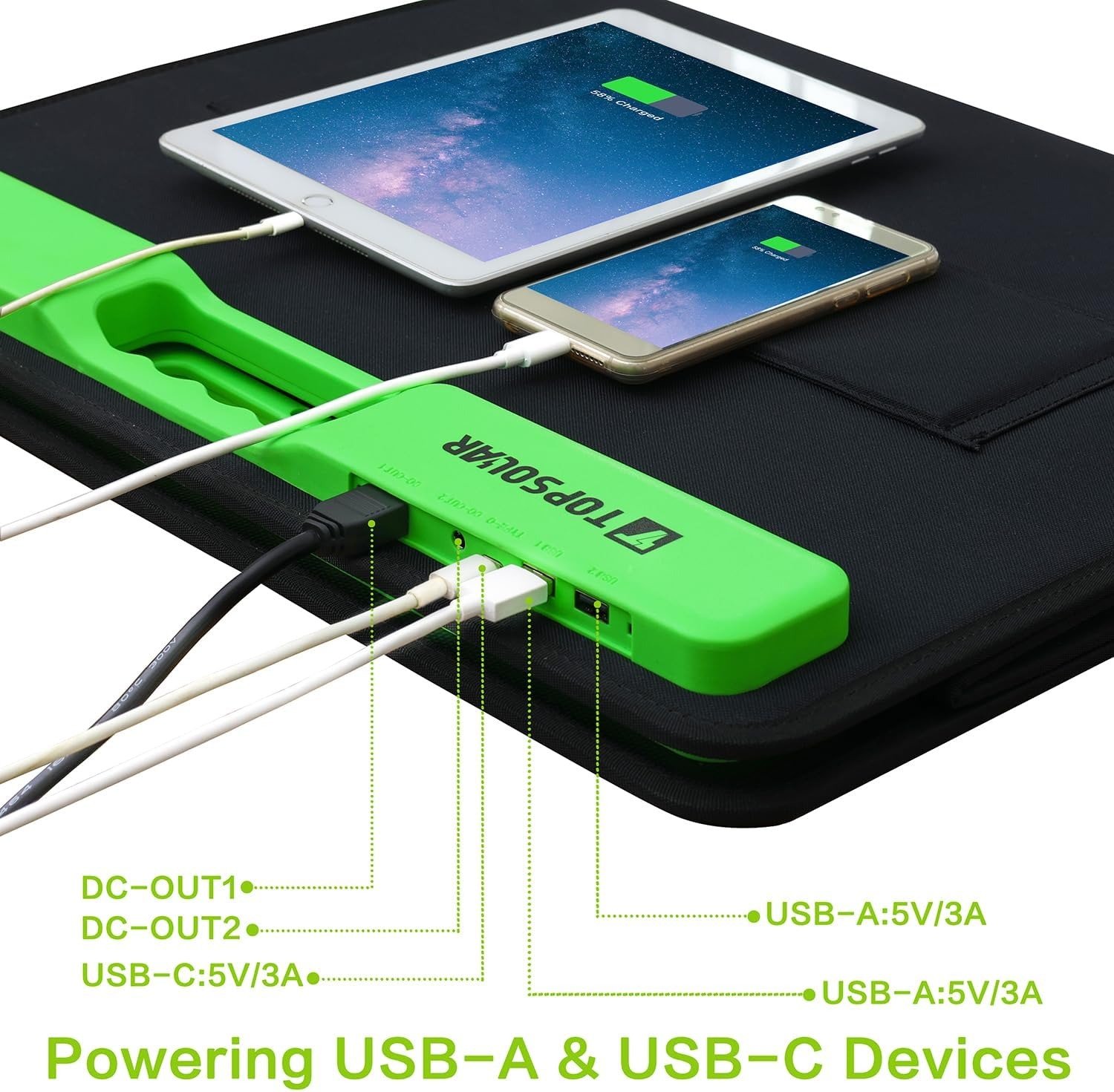 - 【USB Smart and Fast Charging Technology】: Dual USB Ports QC3.0 & 2.0 (5V/9V/12V 2A max), and the USB-C port support PD3.0(24W max).Designed for smartphones and tablets (compatible with iPhone, iPad, Samsung Galaxy), GPS, digital cameras etc. Perfectly compatible with outdoor life and help you deal with unexpected power outages. The build-in smart IC chip intelligently identifies your device, and maximizes its charging speed while protects your devices from over charging and overloading.