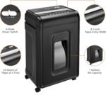 • 4-mode power switch (auto, off, reverse, forward); auto start and anti-jam auto reverse to minimize/clear paper jams; LED indicators (bin full, door open, overload, overheat, power on); 8.7-inch paper-entry width; easy-to-empty 7-gallon pull-out bin; casters included