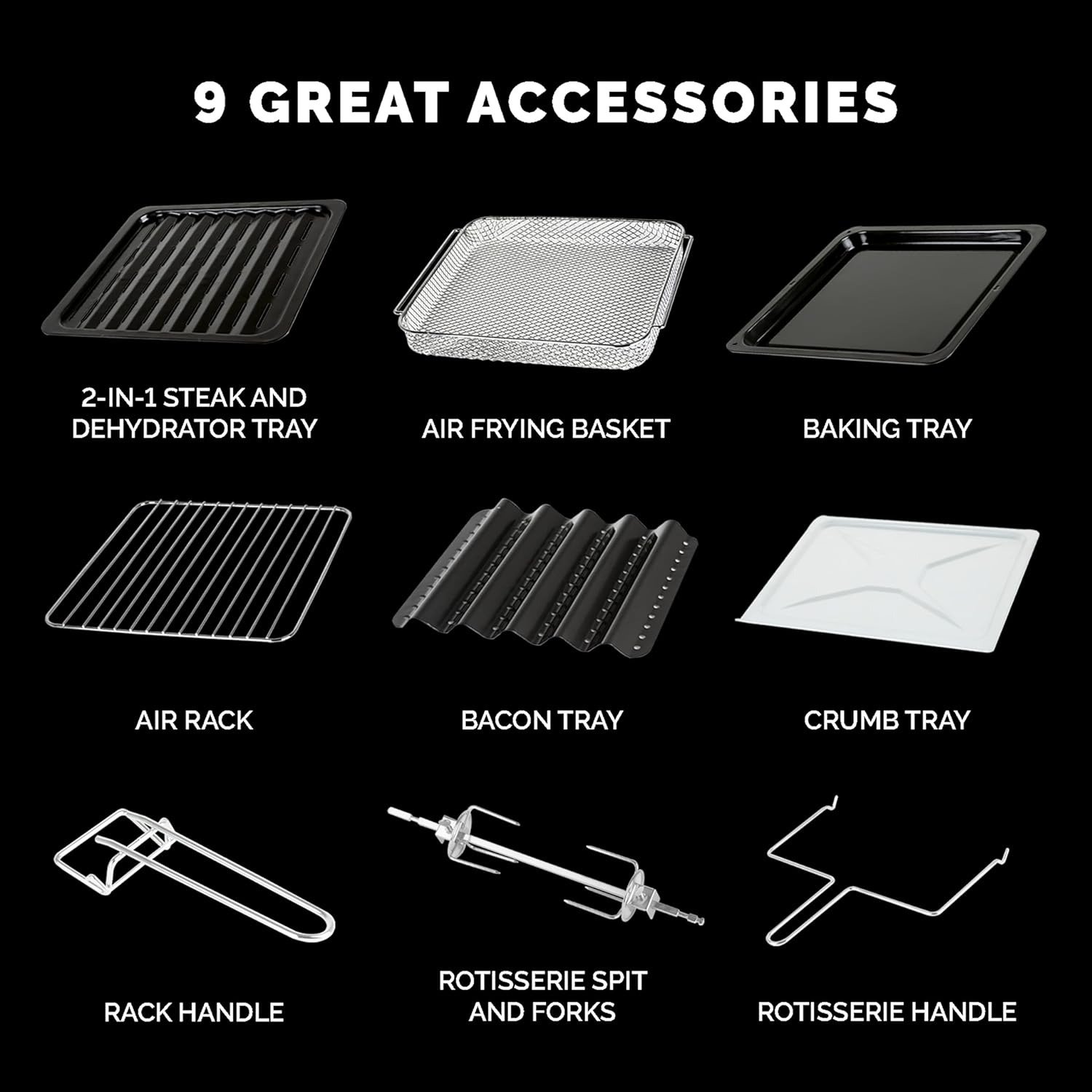 Included Components: 26QT Air Fryer Oven Main Unit, Air Frying Basket, Baking Tray, Air Rack, Crumb Tray, Bacon Tray, Steak Tray, Rotisserie Spit & Forks, Rack Handle, Rotisserie Handle, Bonus Cookbook, User Manual