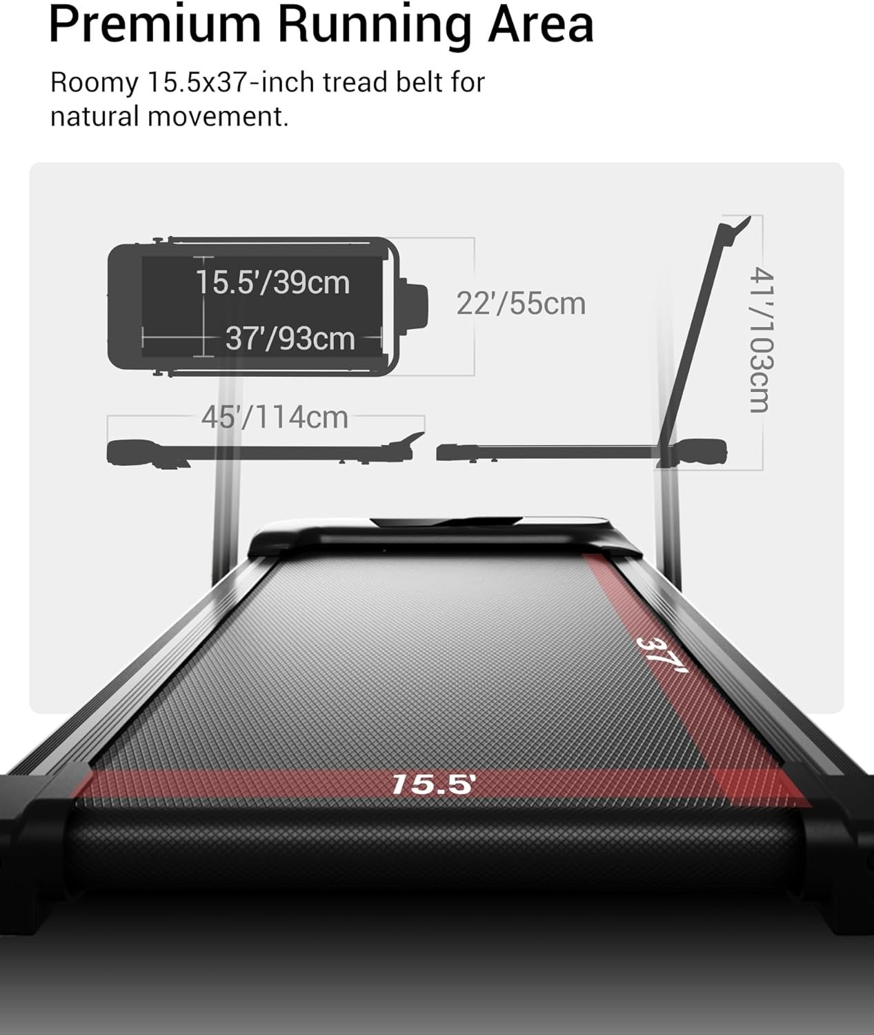 - Space-Saving Foldable Treadmill Design: Achieve maximum space efficiency with this portable treadmill. Its ultra-slim profile, measuring just 4.3 inches when folded, allows for easy storage under beds or sofas. The front transport wheels enable effortless relocation, saving a significant amount of space compared to traditional treadmills. Perfect for small apartments and crowded offices