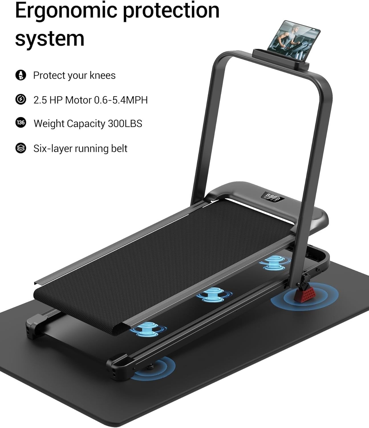 - Secure Walking Pad with Handle Bar for Stable Workouts: Experience confident and supported workouts with our walking pad. The sturdy handlebar and 300 lbs weight capacity ensure safety for users. The 6-layer non-slip running belt, combined with an advanced shock absorption system, is designed to minimize joint impact and provide a comfortable, low-impact exercise. Enjoy peaceful workouts under 45DB, making it perfect for home and apartment use