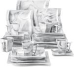 This 30 Piece Porcelain Dinnerware Set in elegant marble grey is a stylish and practical tableware solution crafted for 6 people, featuring a modern square wavy shape with unique natural marble veining that adds sophistication and visual appeal to any casual or formal dining occasion. Each piece is hand-finished with a glossy surface, boasting distinct marble line details that make every plate, bowl, and cup one-of-a-kind, easily coordinating with existing kitchen decor and elevating your food presentation and dining experience.