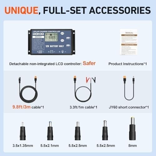 • 【ALL-IN-ONE KIT, READY TO GO】 Includes 300W foldable panel, standalone controller, SAE/XT60/alligator clips, 4 DC adapters (3.5×1.35mm / 5.5×2.1mm / 5.5×2.5mm / 8.0mm), 9.8ft cable, storage bag, and manual—everything you need for quick setup right out of the box.