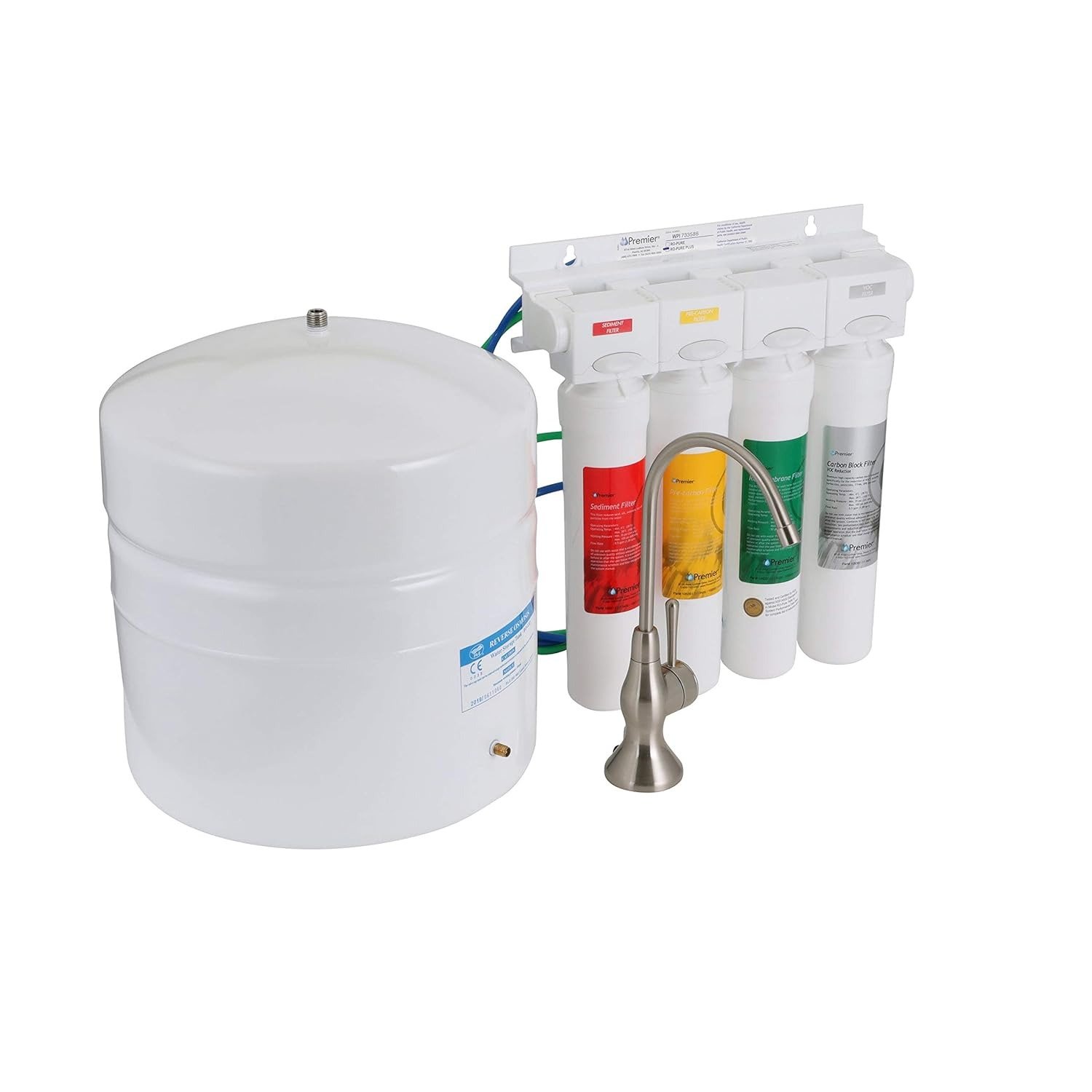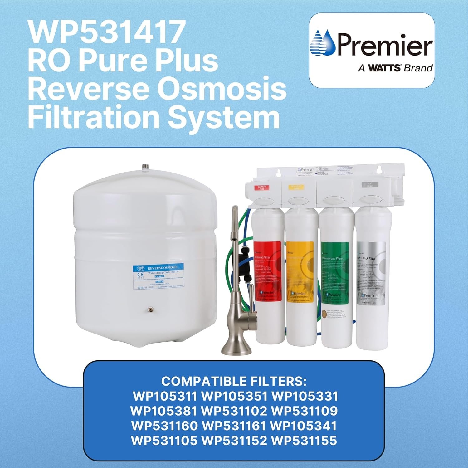 - COMPREHENSIVE RO SYSTEM: Say goodbye to unpleasant tastes and odors with the Watts Premier RO Pure Plus System, a compact reverse osmosis unit designed to fit under small counter spaces. Four pre-installed filters, a parts bag, brushed nickel top-mount twist air-gap faucet, and 3-gallon metal storage tank collectively work together to ensure crystal clear, great-tasting drinking water every time.