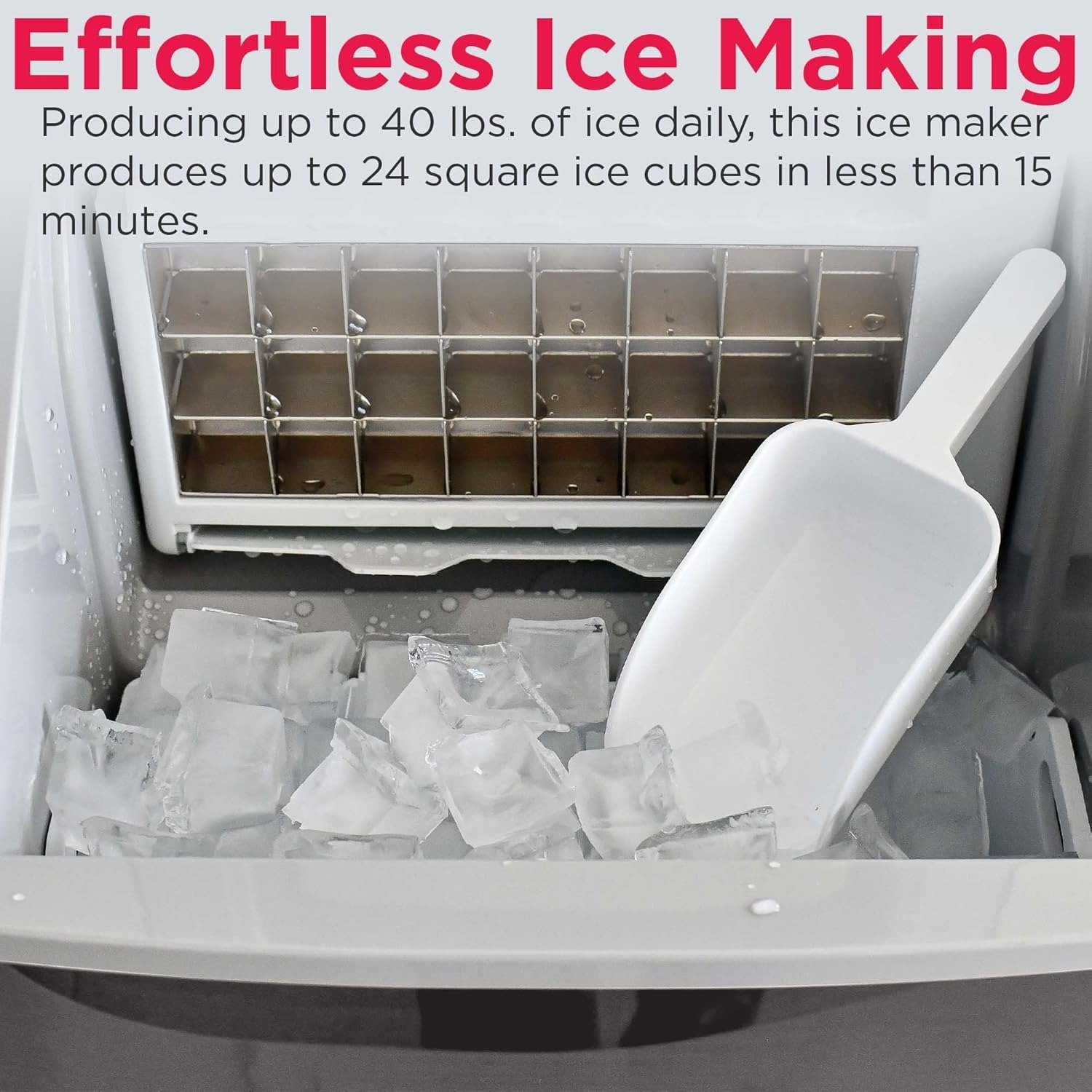 • Bonus Accesory- Enhance your ice making experience with the included ice scoop for easy retrieval of ice cubes. The interior basket holds up to 2.4 lbs. of ice at a time, so you’ll always have ice on hand.