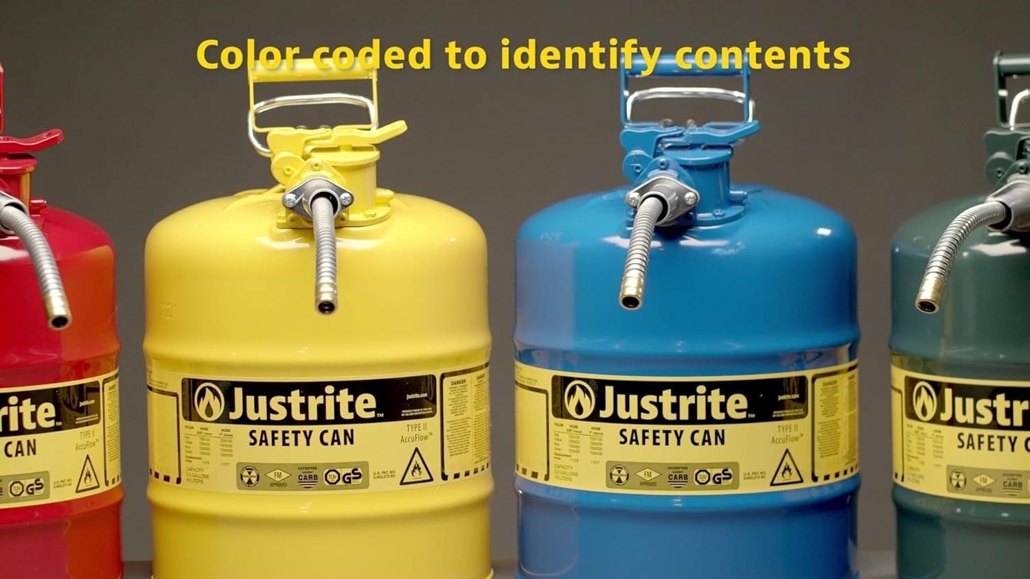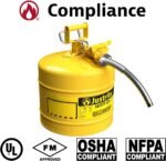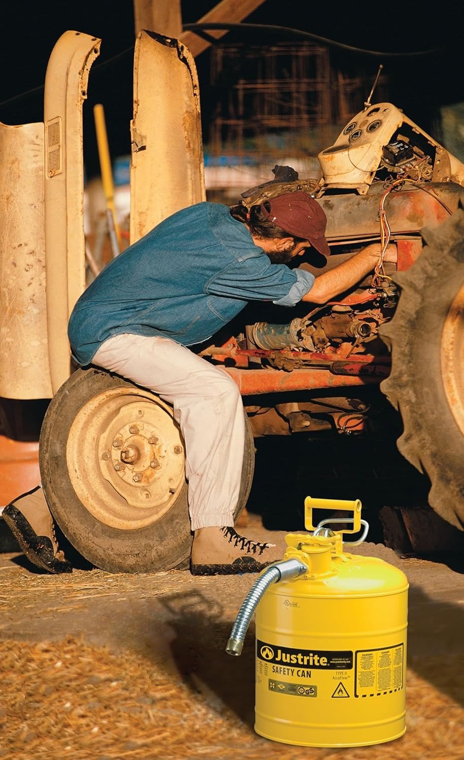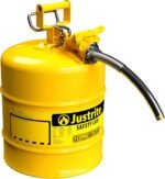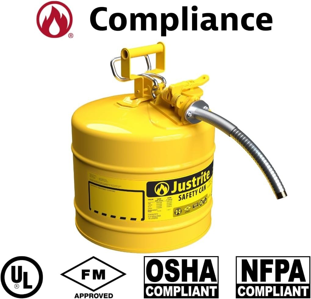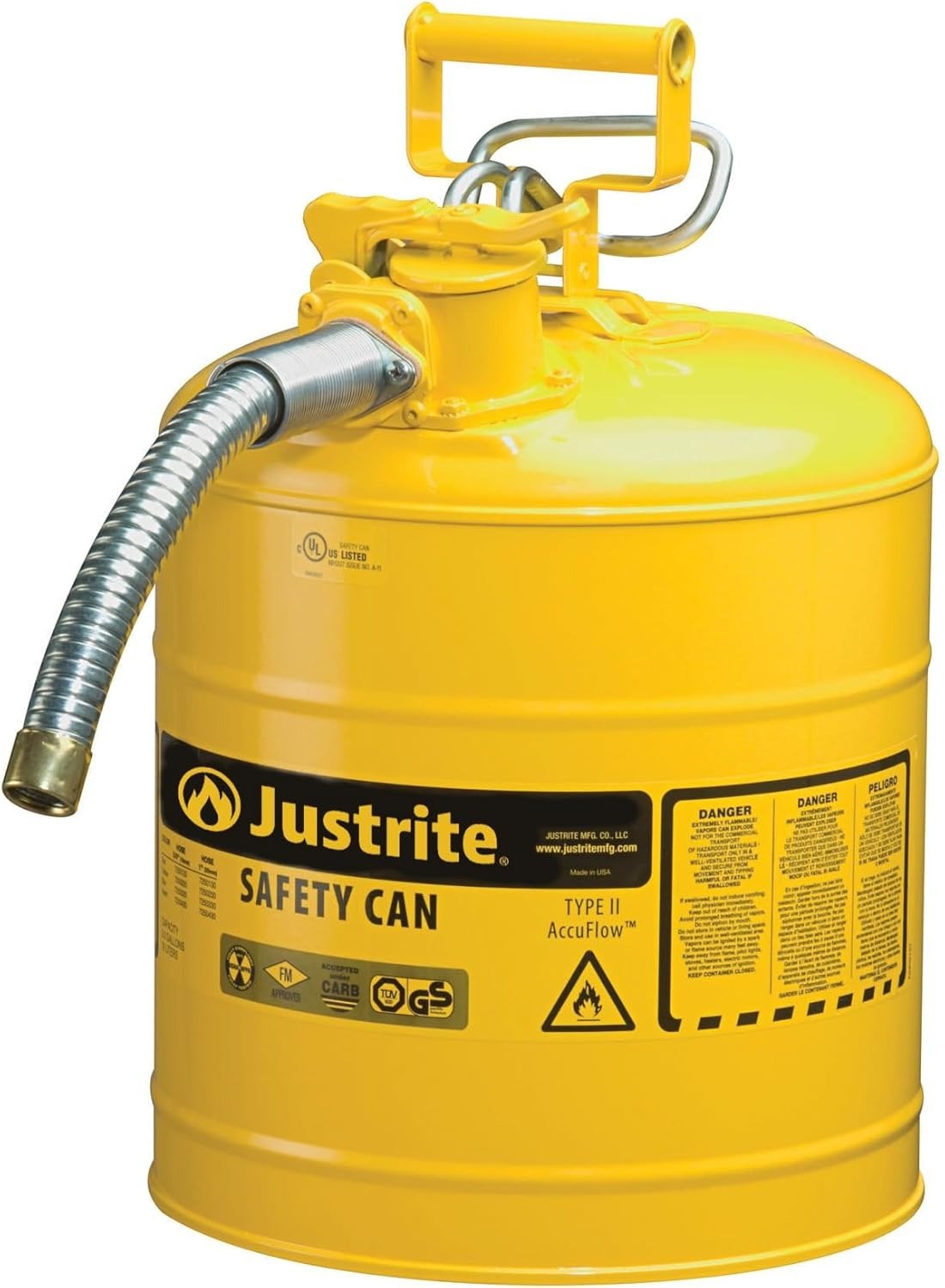 Justrite 5 Gallon Type II Yellow Safety Can for Diesel with Flame Arrester, Self-Closing Lid, and 1″ Flexible Metal Spout, Made in the USA, Galvanized Steel Flammable Storage Can