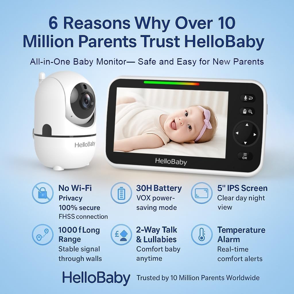 - HelloBaby 5” Baby Monitor with 3 Cameras and Audio: 2024’s Most Trusted Baby Monitor, “Best Baby Monitors” by BUMP… Baby monitor comes with 3 cameras (up to 4 cameras can be connected), enabling simultaneous monitoring of multiple rooms or multi-angle monitoring of a single room. The monitor can also be set with a camera loop function: the monitor automatically switches to the next room every 10 seconds. Free your hands!