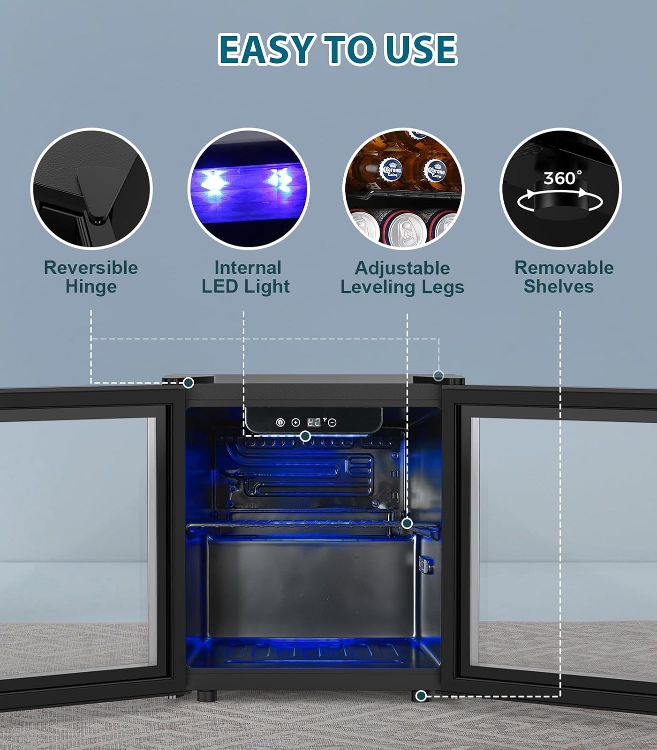 • Compact but Spacious: The mini cooler is compact but very spacious, featuring a 1.3cu. ft volume that can fit up to 50 standard cans! Thanks to its sturdy metal partition, you can organize your drinks more effectively and store wine bottles, beer cans, soda, water, juice, and more!