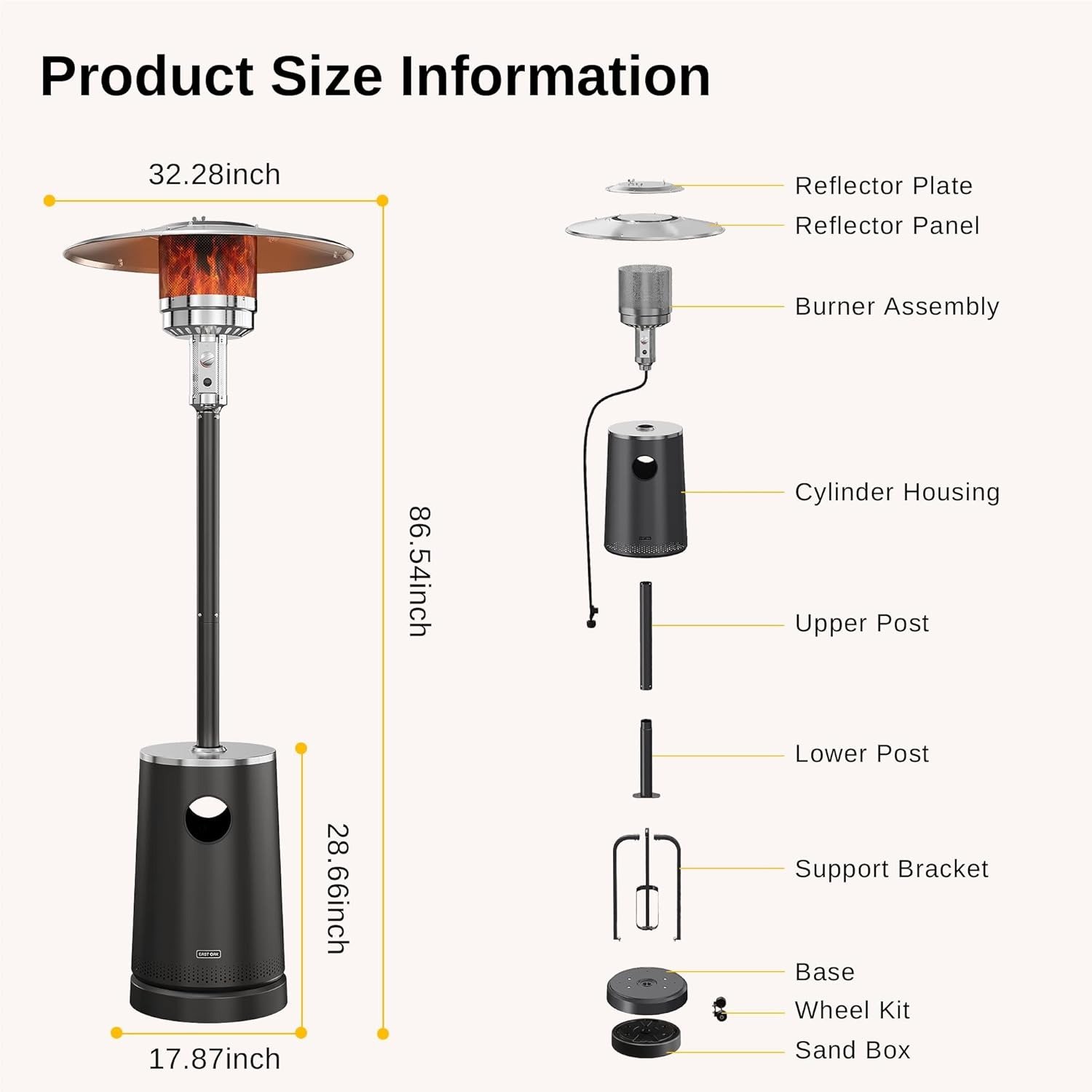 Included Components: Outdoor Propane Patio Heater, Weight-Adjustable Water Tank, Mounting Hardware