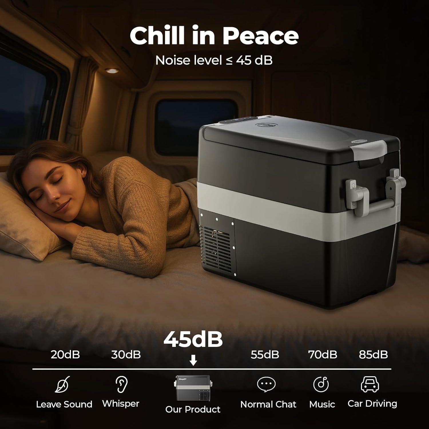 Designed for safety, comfort and durability, the fridge includes a 3-level battery protection system to prevent vehicle battery drain, with customizable cut-out and cut-in voltages for 12V/24V DC power. It operates at just 45dB—quieter than normal conversation—ensuring undisturbed sleep during camping or long drives. The unit is CE and FCC certified, with a 2-year tech support warranty for the compressor and accessories, providing peace of mind.