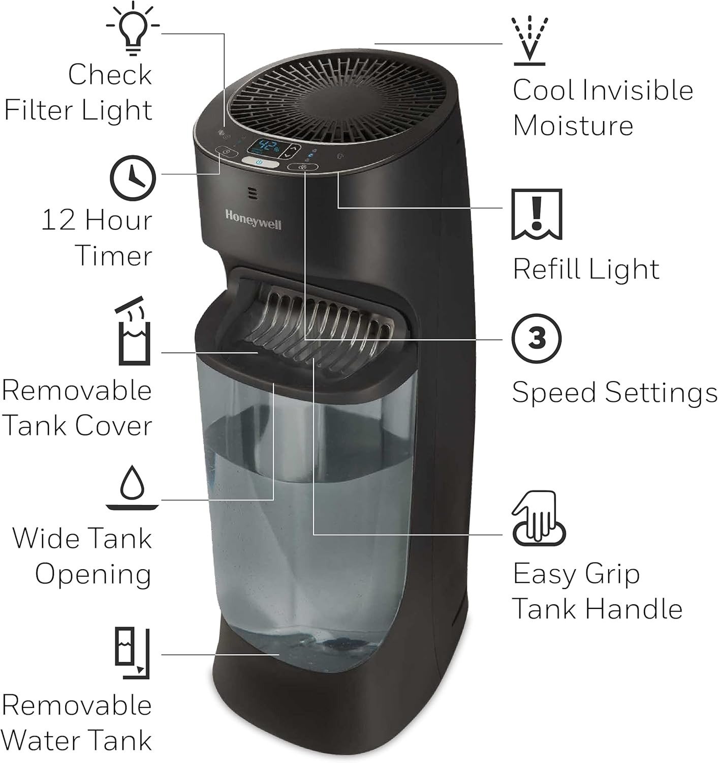 Core Features: Digital Humidistat, Top-Fill Design, 12H Timer, Auto Shut-Off, Filter Check Light, Refill Reminder, Humidity Reach Indicator