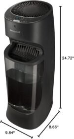Designed for quiet performance, the evaporative humidifier operates at a low noise level, creating a peaceful environment for bedrooms and offices. The rectangular tower shape (22cmD x 25cmW x 62.8cmH) with a sleek black finish complements any home or office decor, while the slide-out filter door enables easy filter access and replacement. It also supports optional antimicrobial cleaning cartridges (recommended every 30 days) for enhanced hygiene and mist quality.