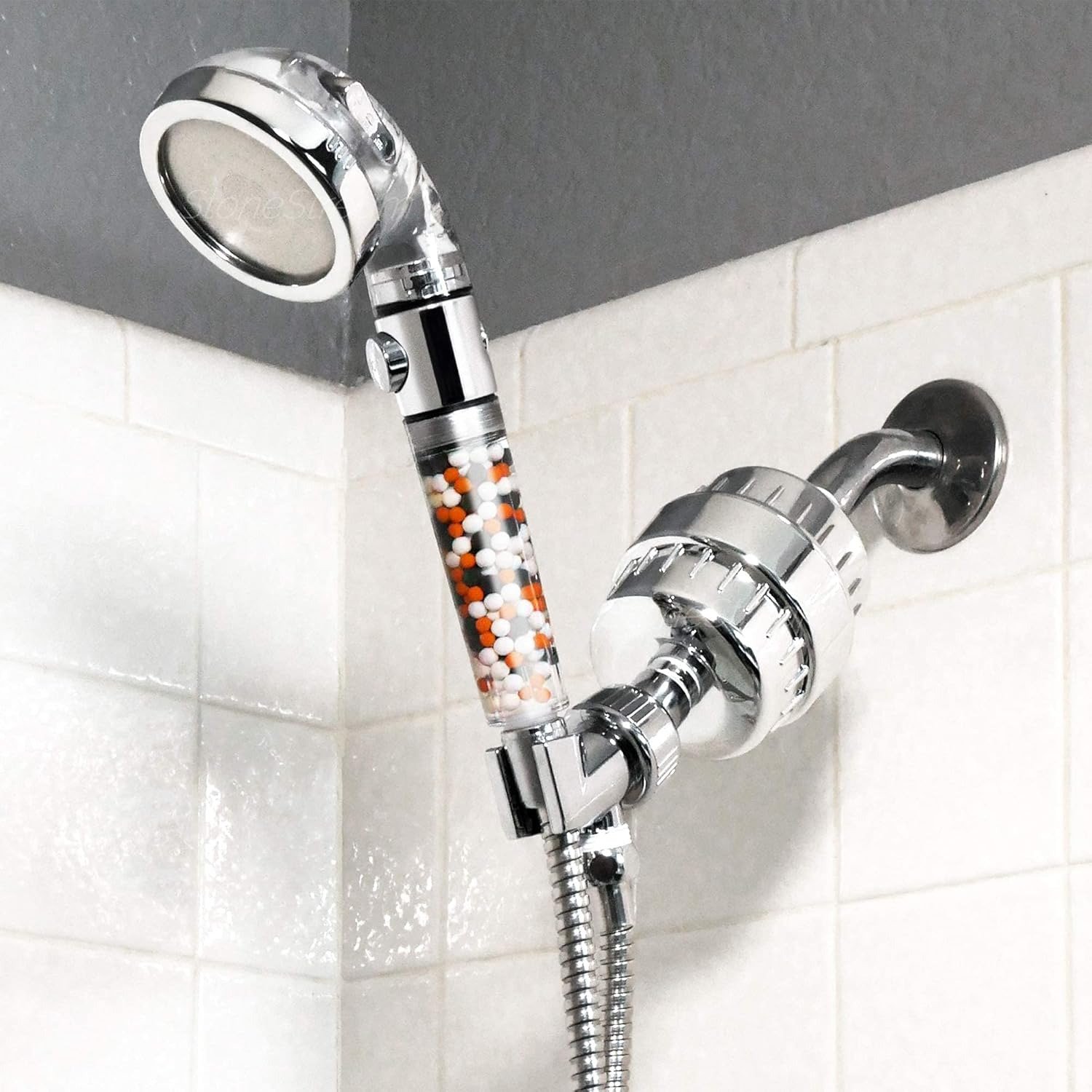 Included Components: Handheld Shower Head, 5-Foot Hose, Wall Adapter, 15-Stage Shower Filter, Threaded Seal Tape, Replacement Mineral Stones, In-Handle Mineral Stones