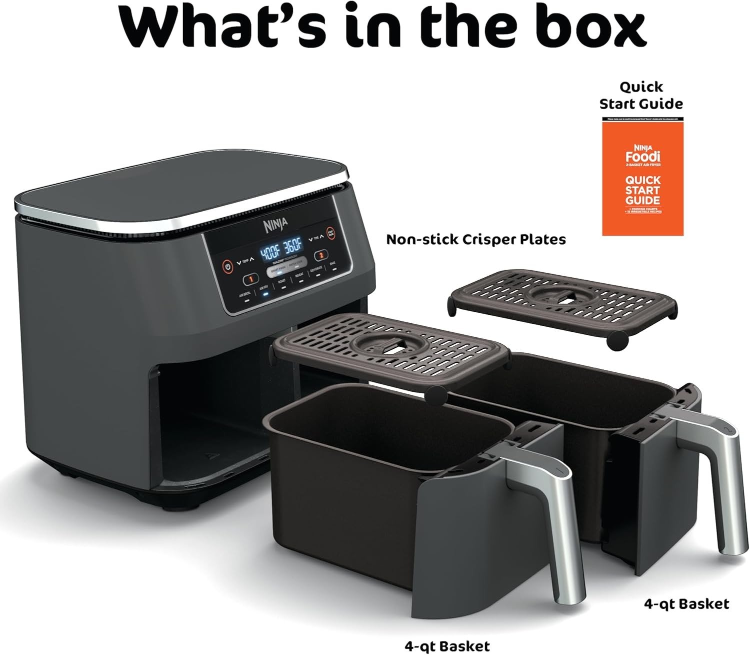 Included Components: 8QT Dual Basket Air Fryer Main Unit, 2 x 4QT Nonstick Baskets, 2 x Nonstick Crisper Plates, 15 Recipe Book, Cooking Reference Charts
