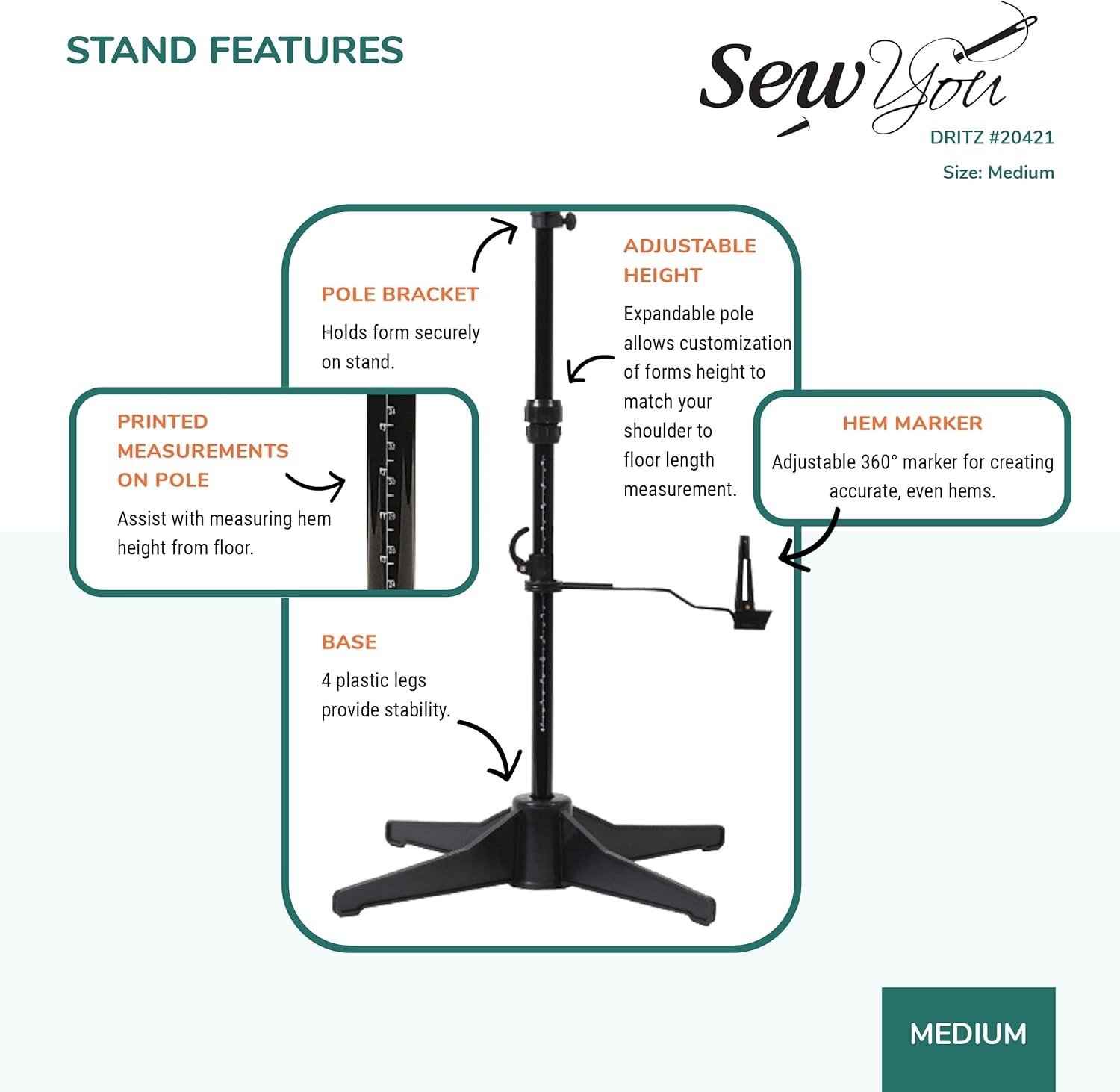 - Precision Tailoring: Printed pole measurements and a 360-degree adjustable hem marker make it easy to create accurate, even hems every time