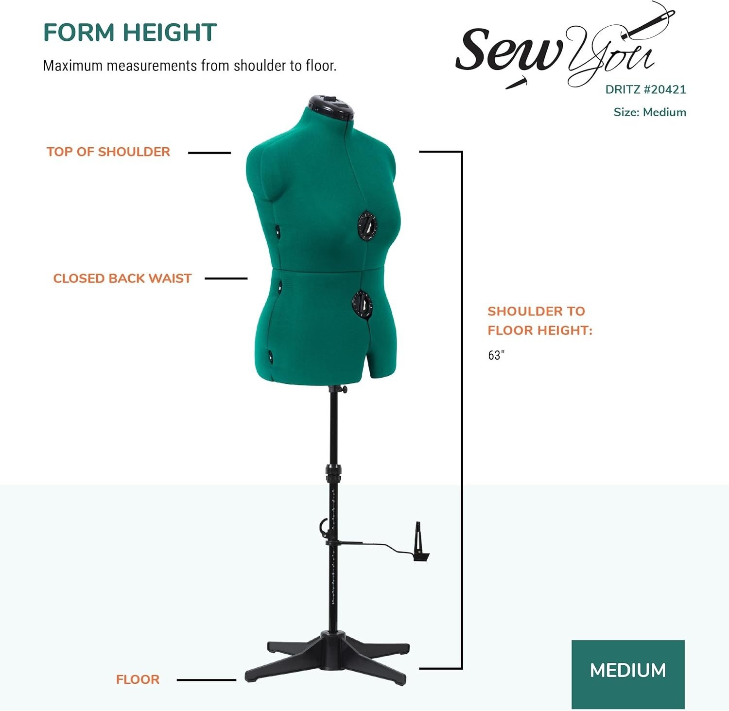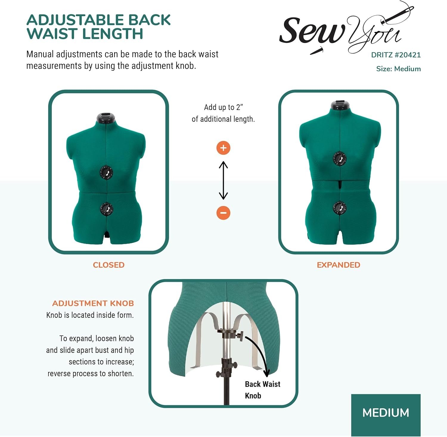 - Custom Fit: 9 easy-turn wheels at the bust, waist, and hips adjust in ½” increments by simply squeezing and turning; 2 auto-set dials at the front bust and hips allow for precise shaping, while the rotating 1 dial on top adjusts the neck size