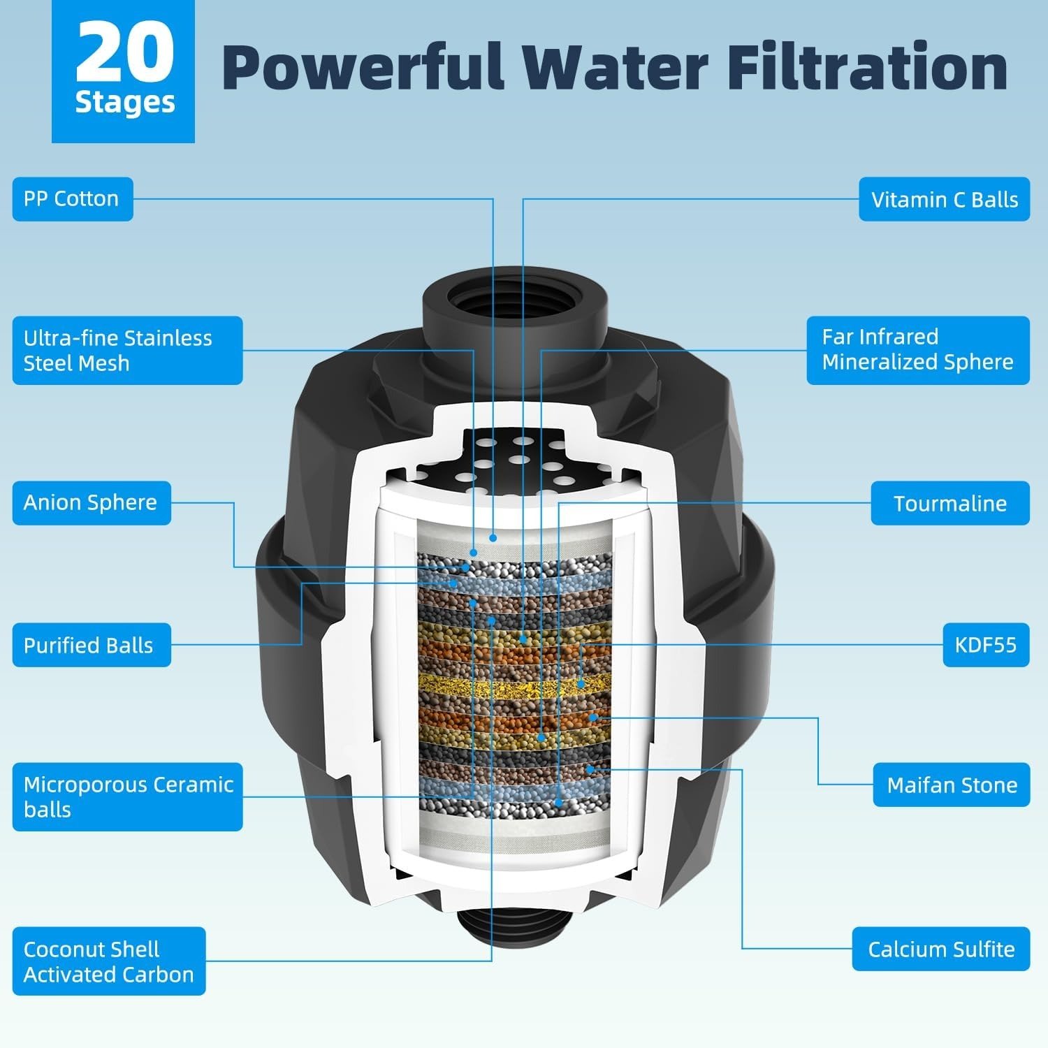 • Excellent 20 Stages Shower Head Filter: Experience the ultimate water purification with the Hibbent advanced shower filter, featuring 20-stage water filtration, redox media, calcium sulfite, activated carbon, and ceramic beads. This innovative filter effectively eliminates odours, balances pH levels, and infuses beneficial minerals into your skin, nails, and hair. Not only does it act as a moisturizer and purifier, but it also provides an unparalleled sensation for sensitive skin