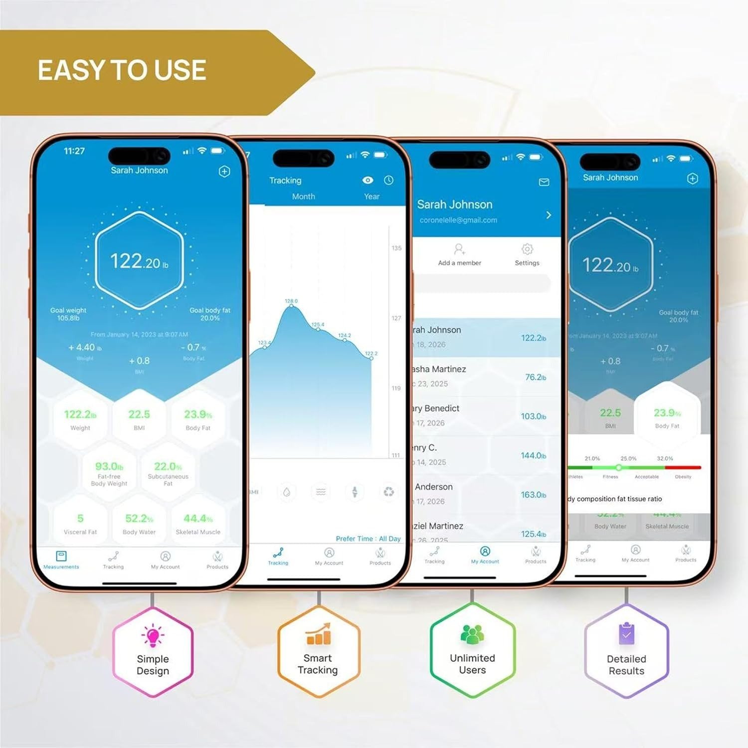 Tracking Metrics: 13 Key Metrics (Body Weight, Body Fat Percentage, Total Body Water, Muscle Mass, BMI, BMR, Bone Mass, Skeletal Muscle, Fat-Free Body Weight, Subcutaneous Fat, Protein, Metabolic Age, Visceral Fat)
