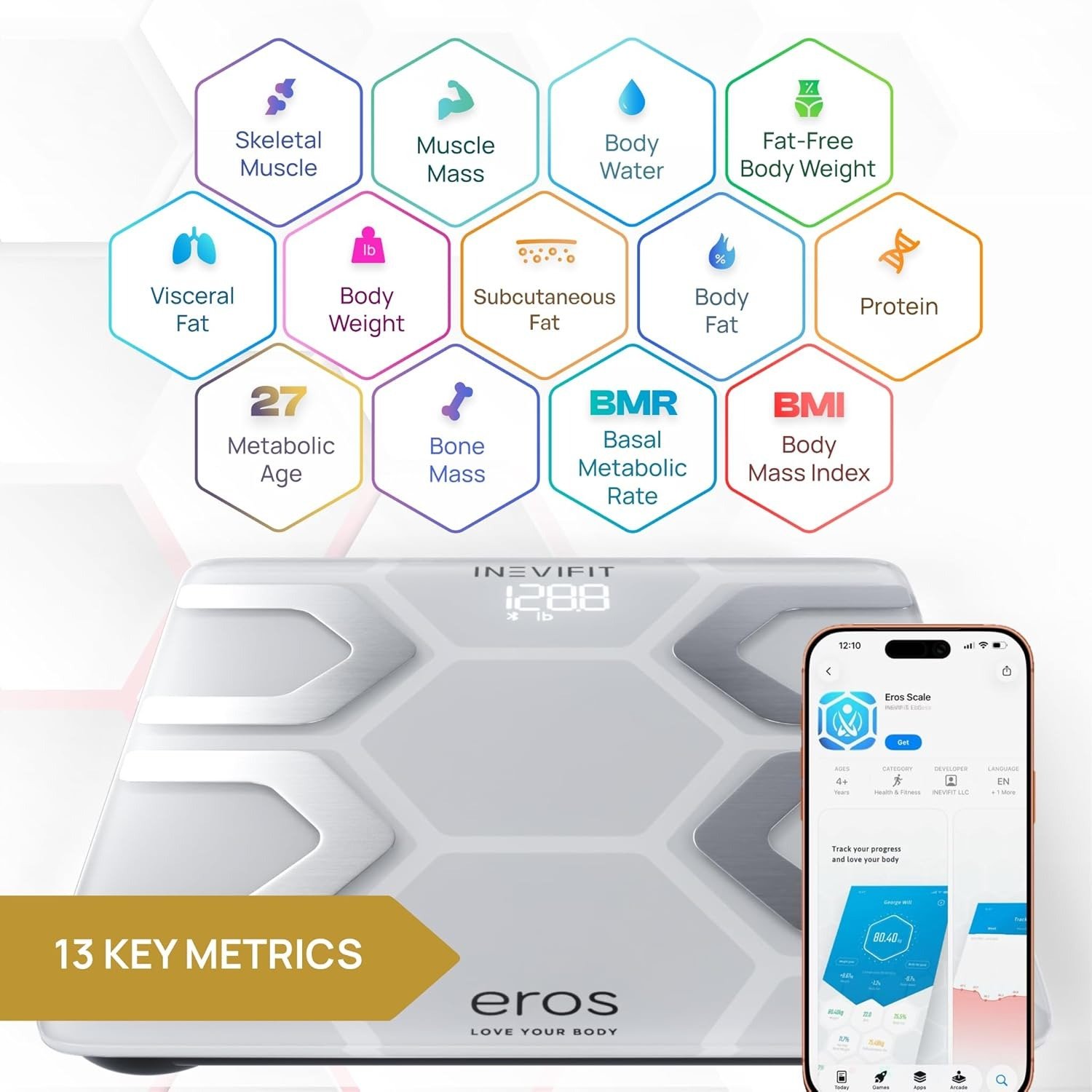 Compatible Apps: Eros Scale App (Free), Fitbit, Apple Health, Google Fit