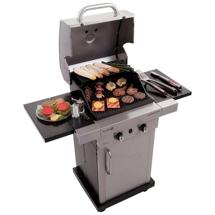 • 2-burner 18,000 BTU gas grill provides 325 sq. in. of primary cooking space on porcelain-coated grates, plus 120 sq. in. on a porcelain-coated warming rack